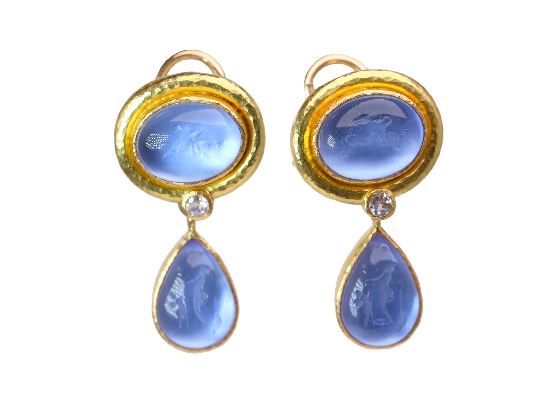 These 19k yellow gold blue venetian glass earrings from Elizabeth Locke feature an intaglio etching design with a mother of pearl back on both the charm and the earring as well as a round diamond. A stunning Set of Earrings.