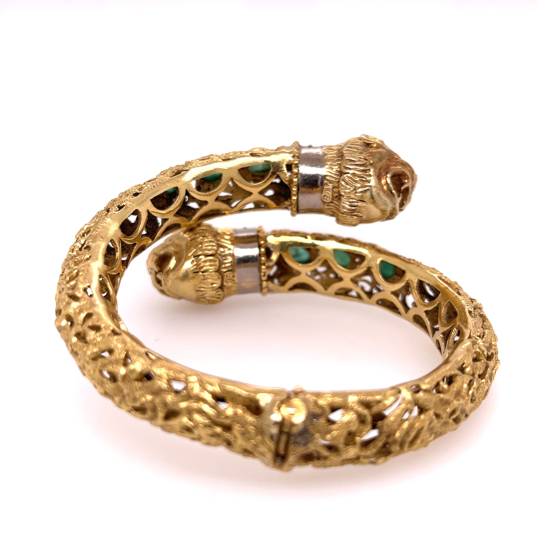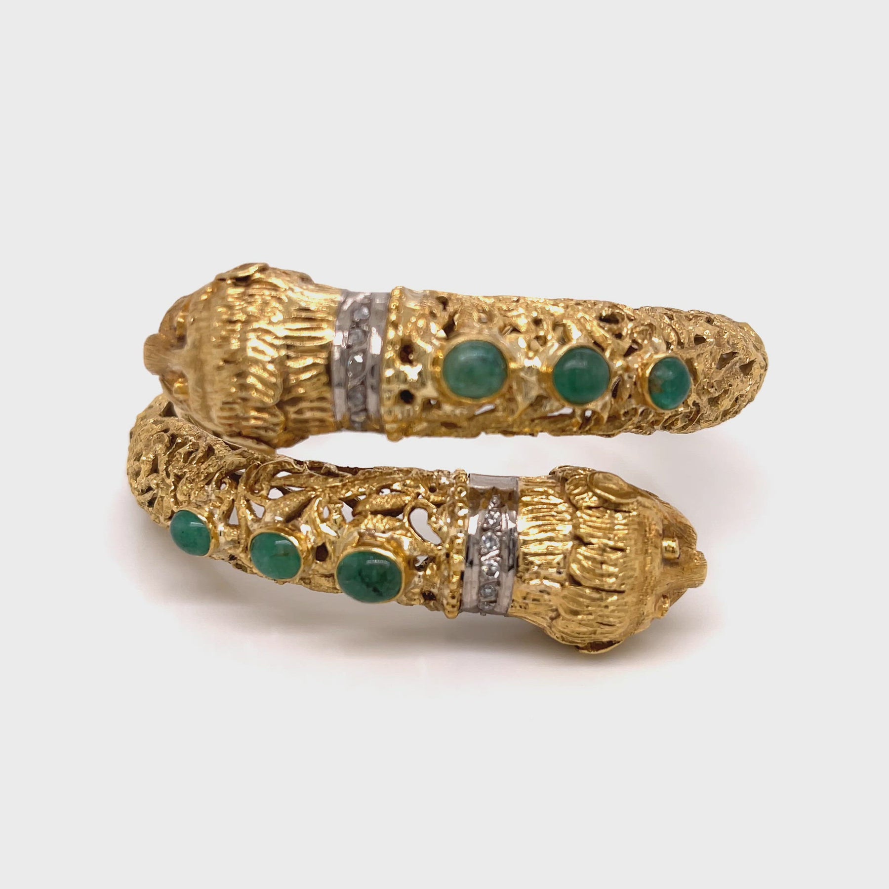 This stunning bracelet features 6 oval cut cabochon jade, diamonds and Bezel set rubies for eyes. The bracelet makes two lion heads at either end. 6 inches diameter.