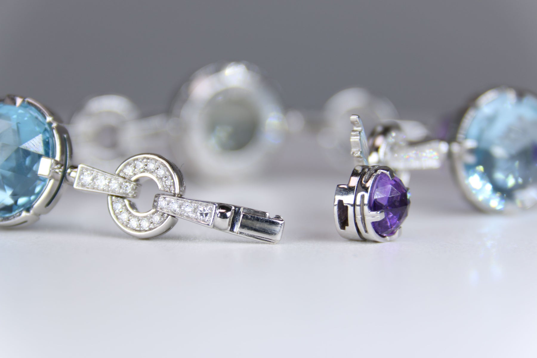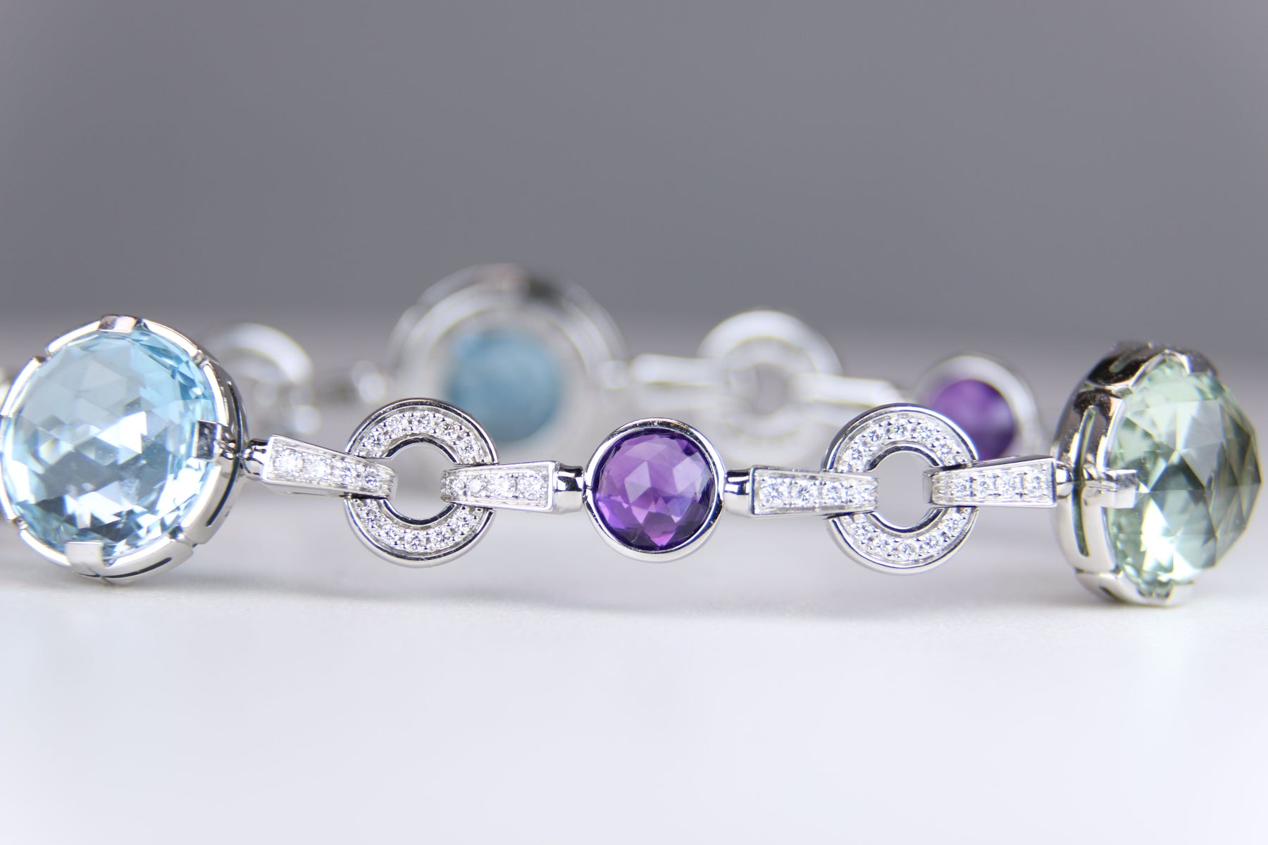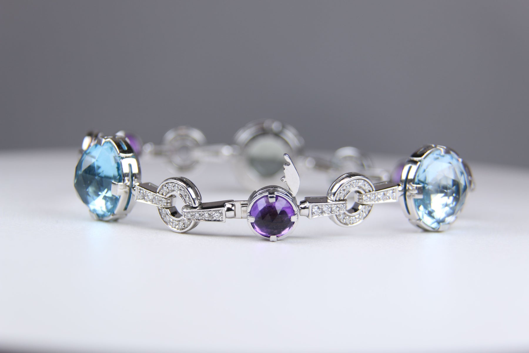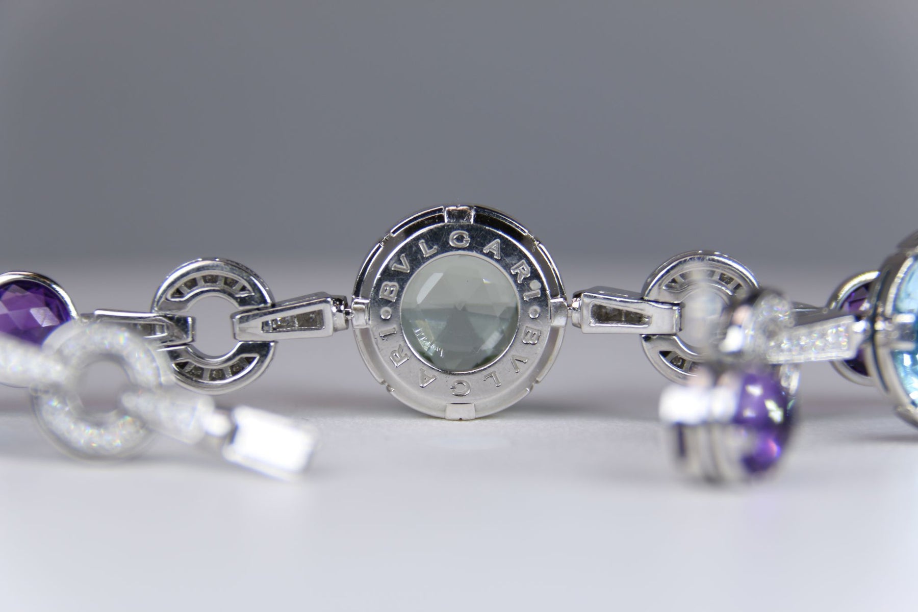 This Bvlgari diamond and gemstone Estate Bracelet is an elegant piece combining aquamarine, amethyst, and Diamonds.