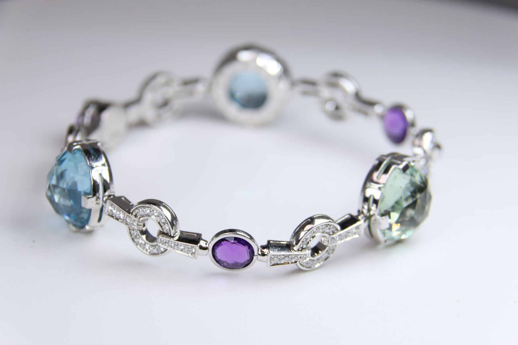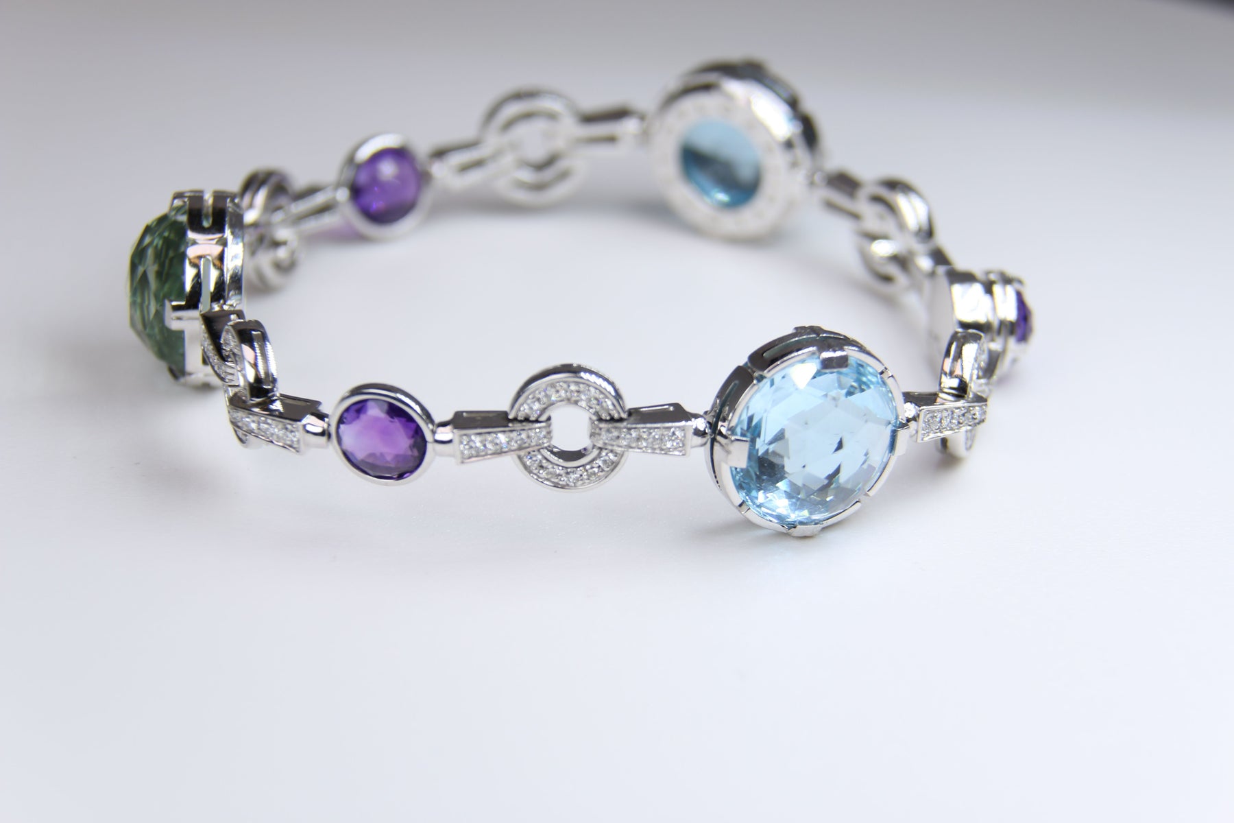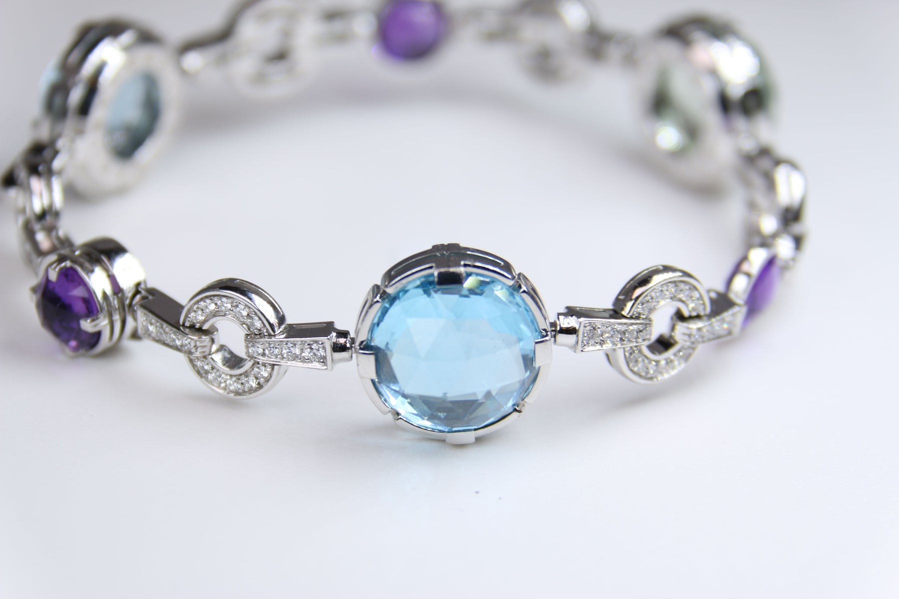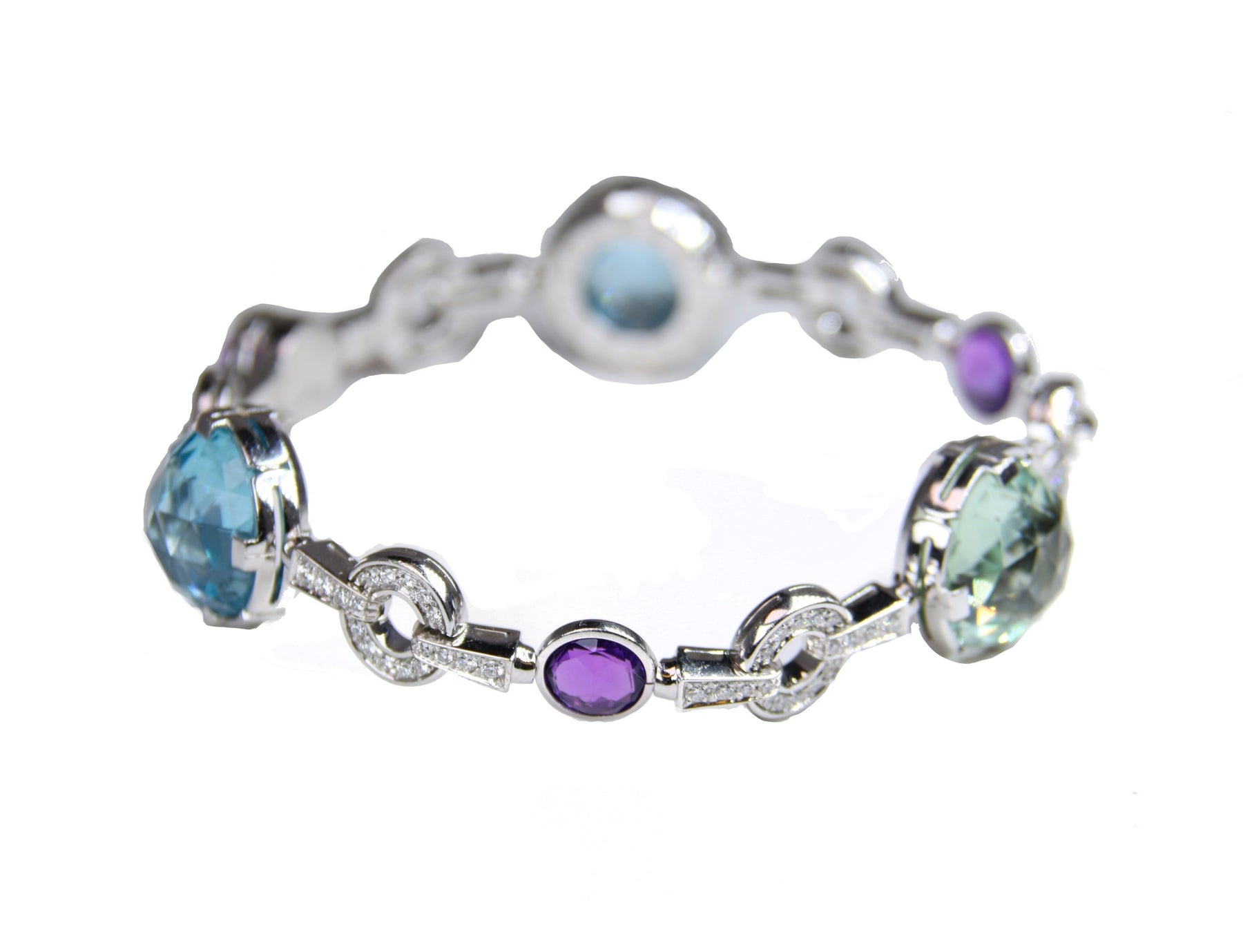 This Bvlgari diamond and gemstone Estate Bracelet is an elegant piece combining aquamarine, amethyst, and Diamonds.