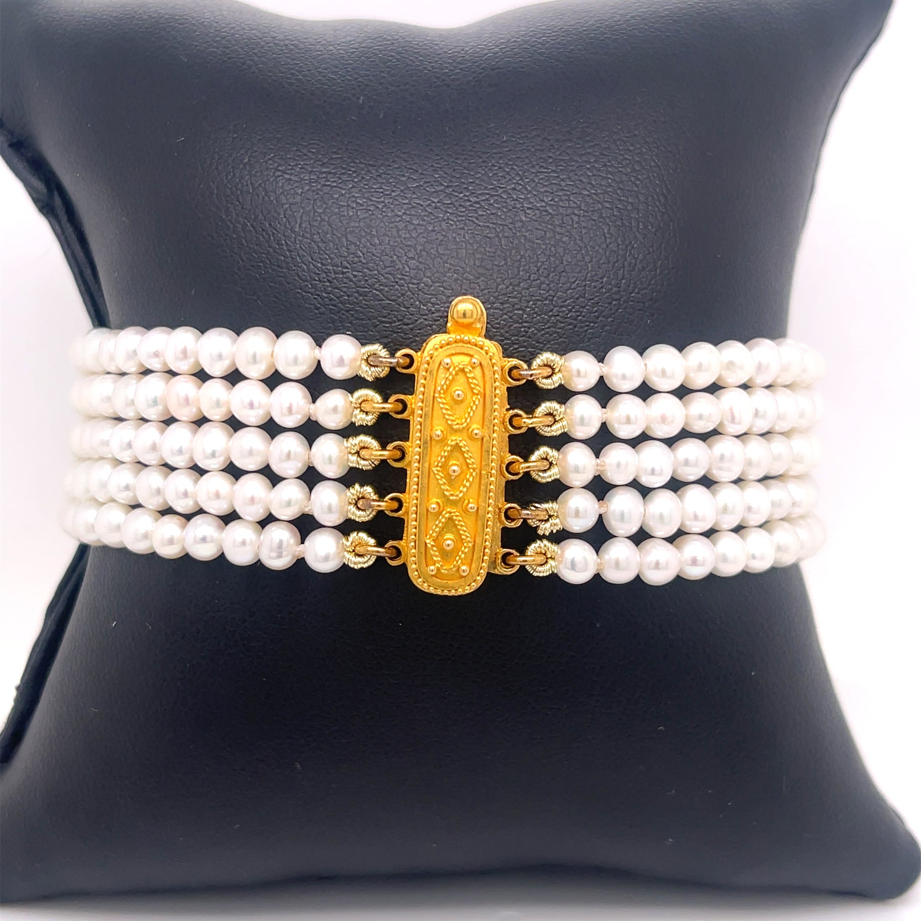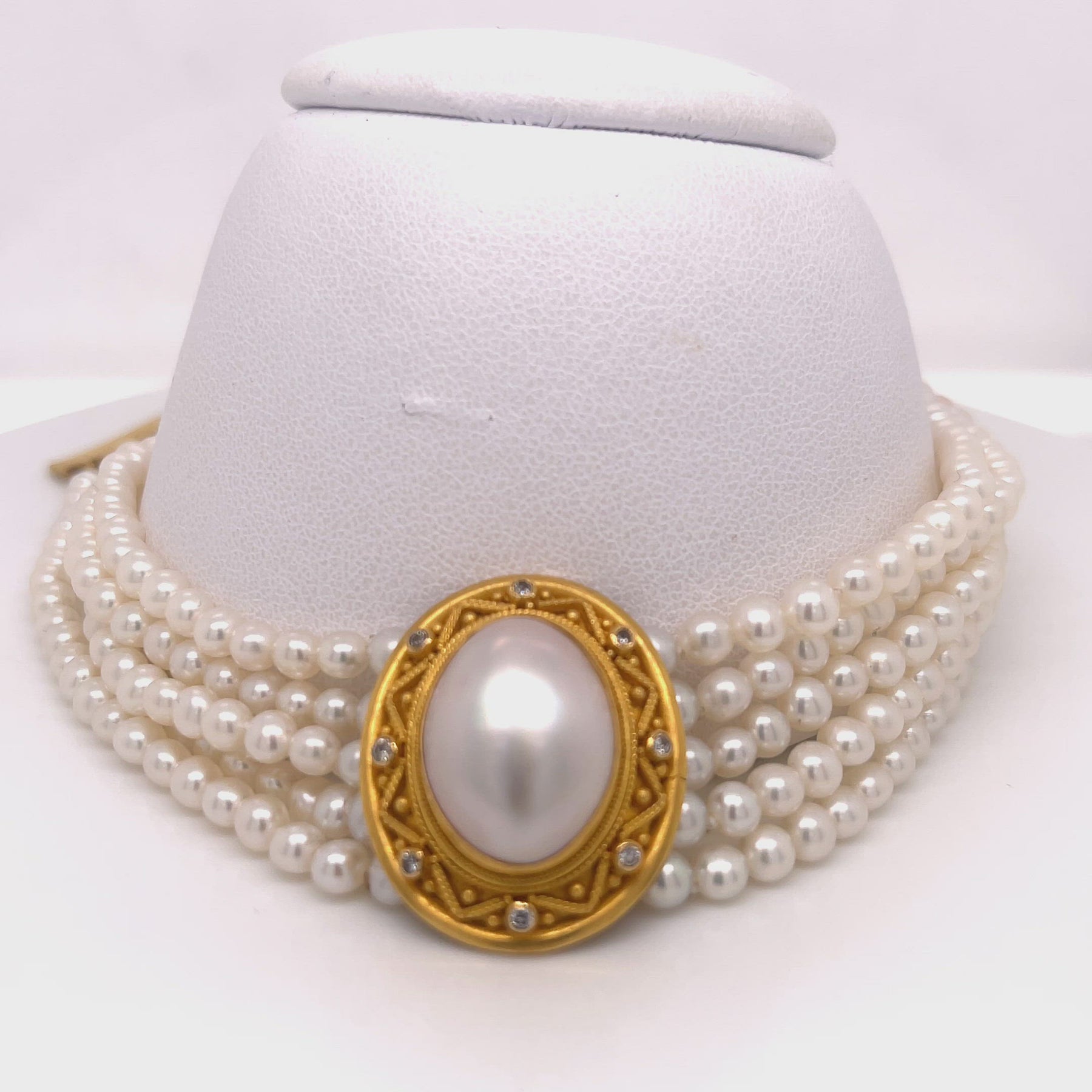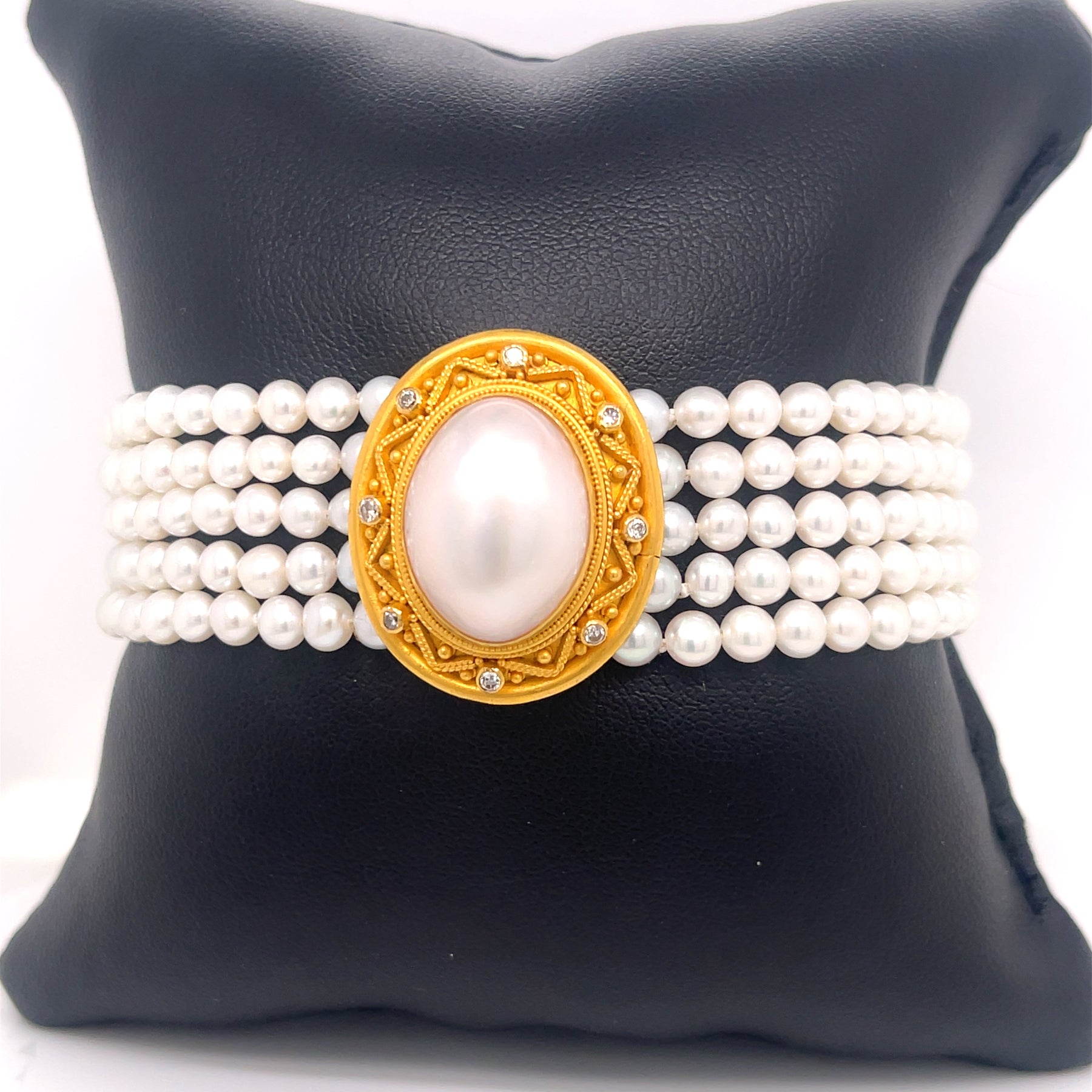 Carolyn Tyler pearl and diamond bracelet in 22K gold. The bracelet features five strands of pearls on each side, with an oval mabe pearl in the center framed by eight diamonds. Stamped 22k C TYLER INDONESIA 2909. 7 inches in length.