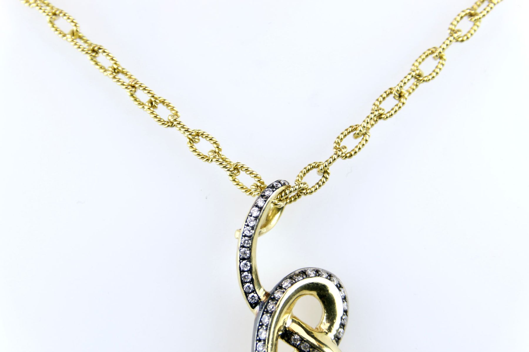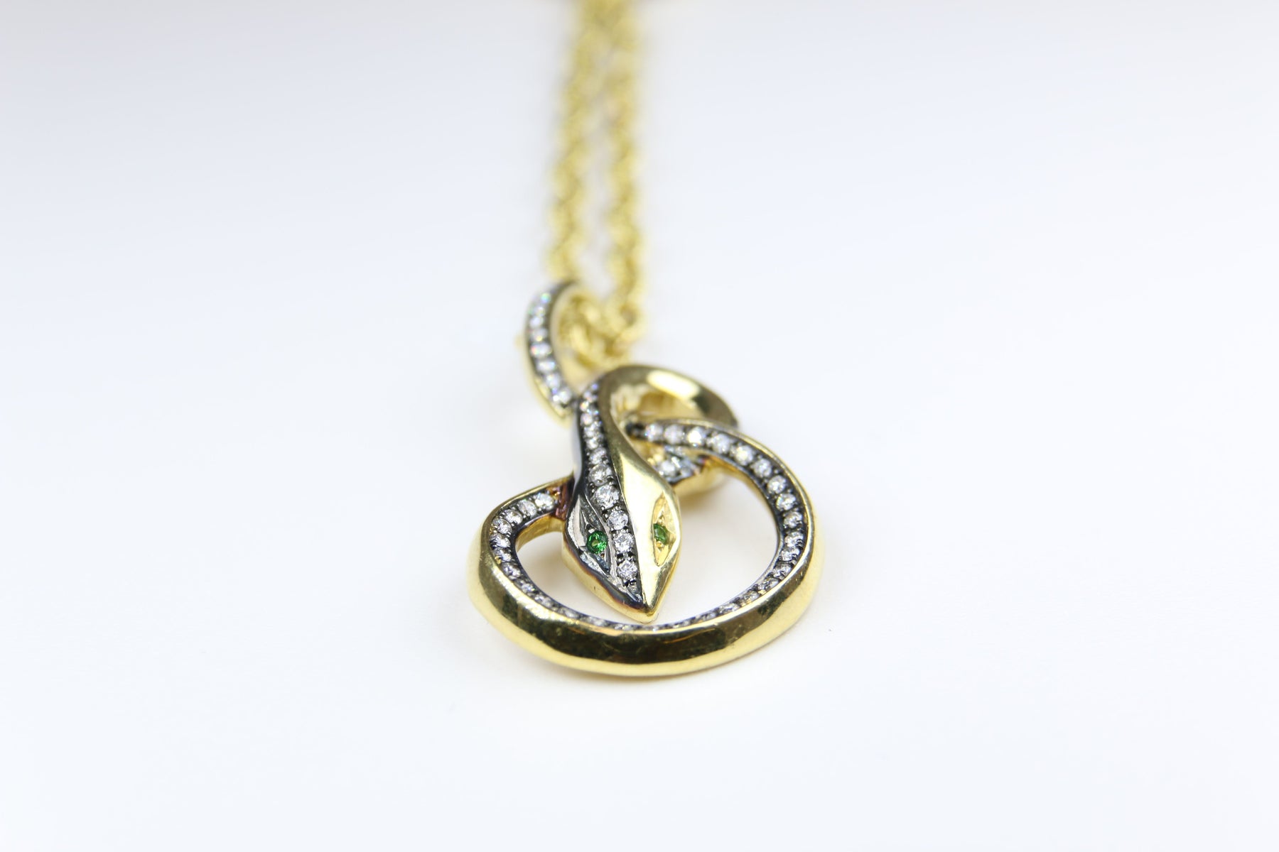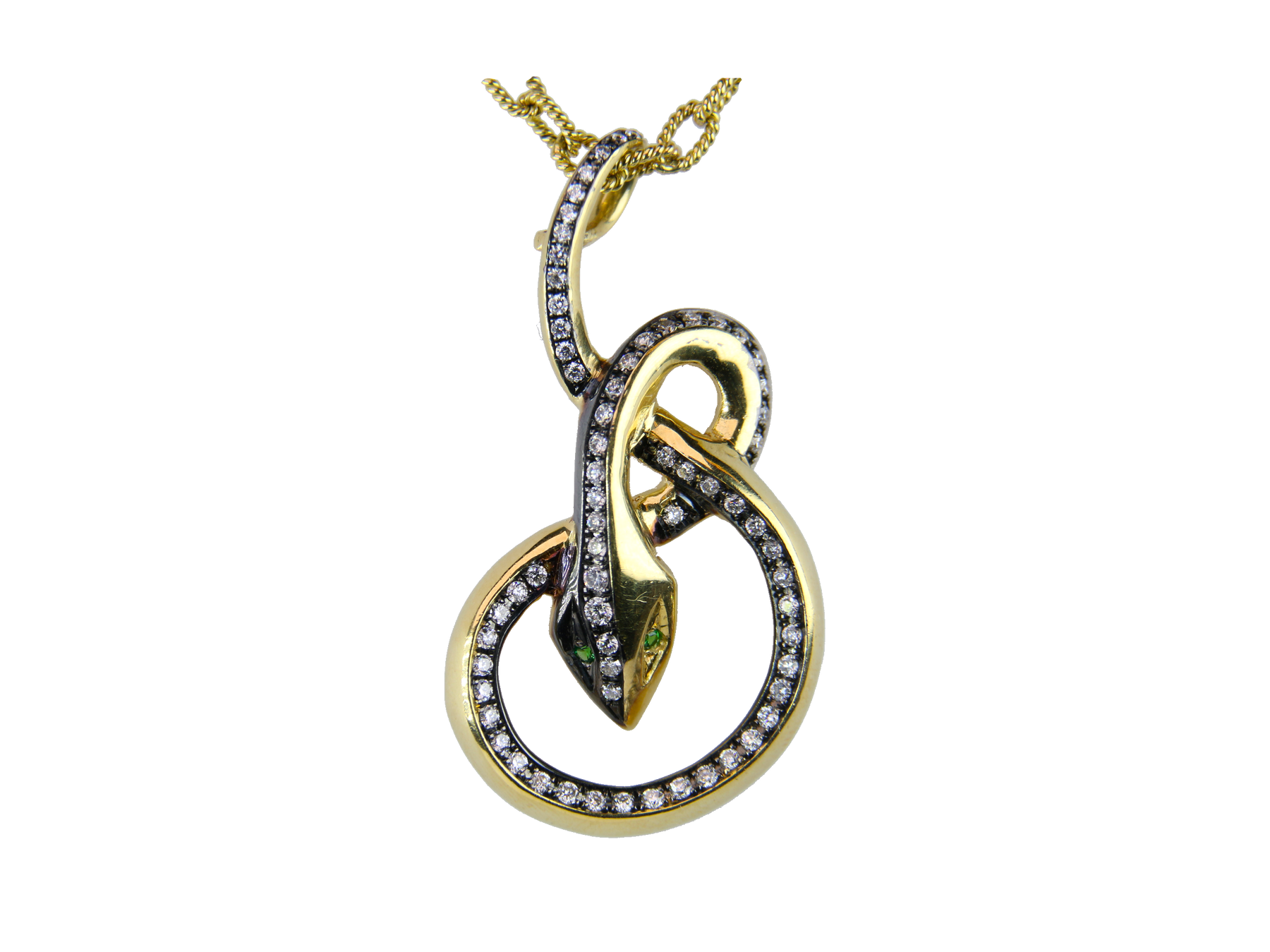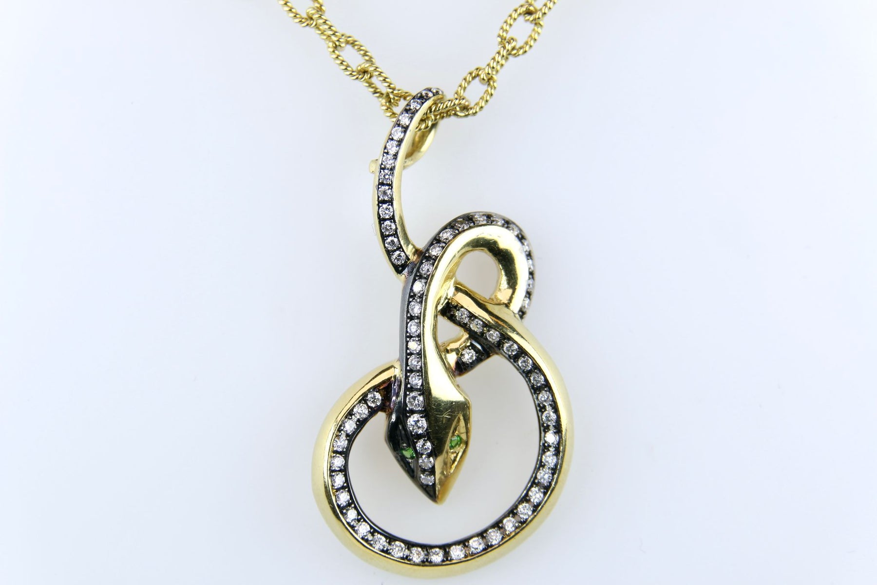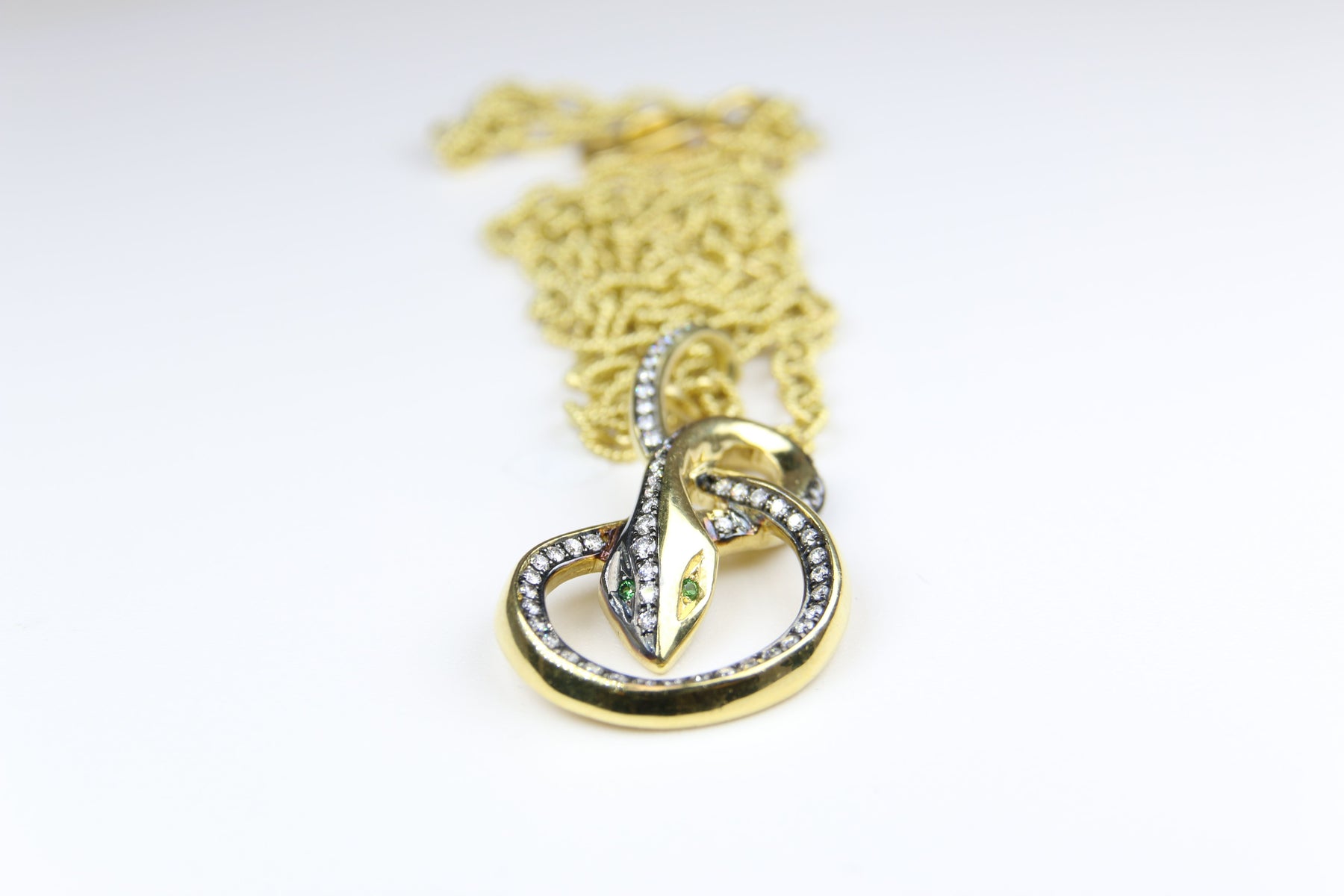 This diamond and emerald snake pendant is 10 in. in length and approximately 0.75 in. wide with 18k yellow gold and diamonds. The emeralds pop set with diamonds the piercing emerald green eyes of this snake make a beautiful accent piece stand out from the rest of your collection.