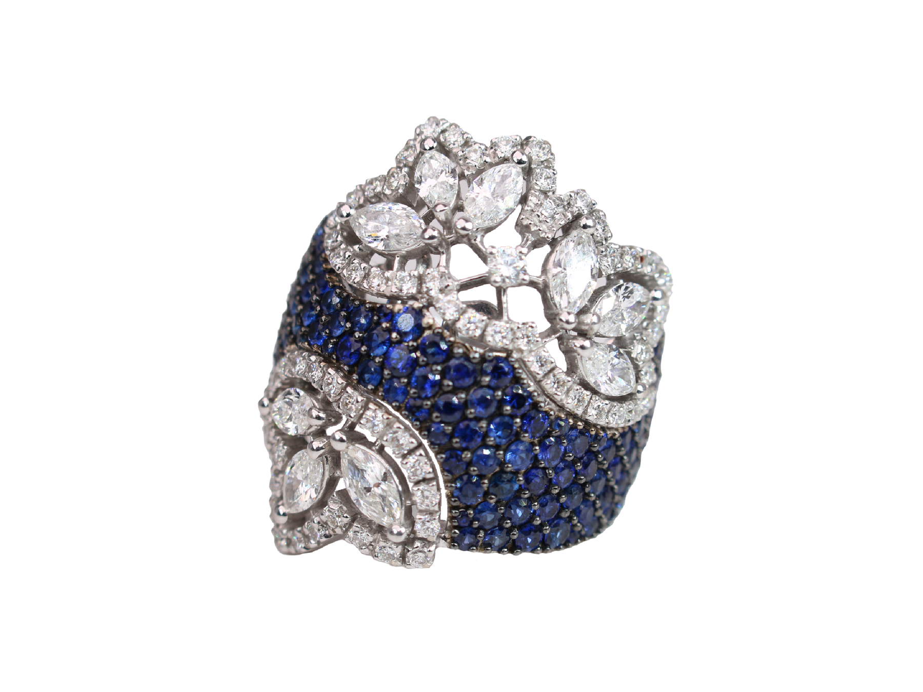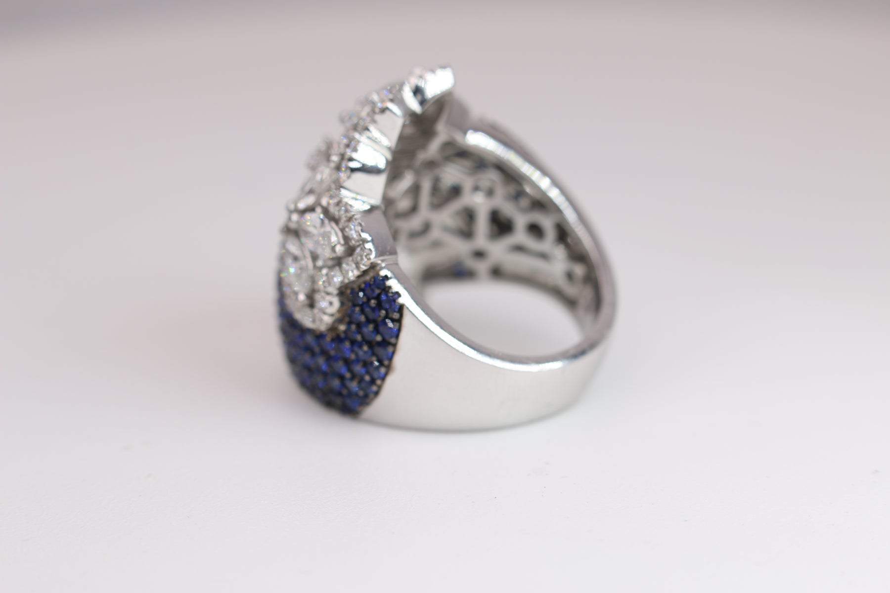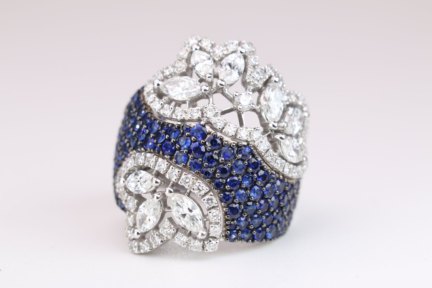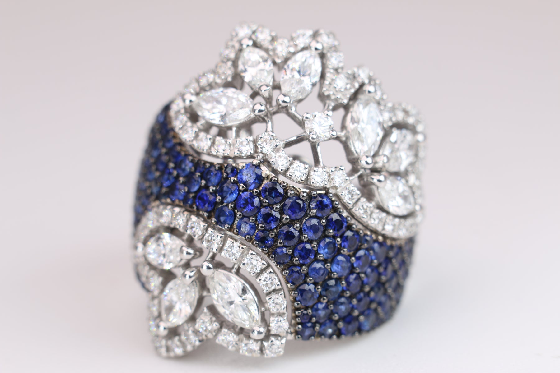 This is a stunning diamond and Sapphire ring set in 18k White gold with 2.18 cts of Sapphires and 2.30 Cts of Diamonds. An excellent piece!