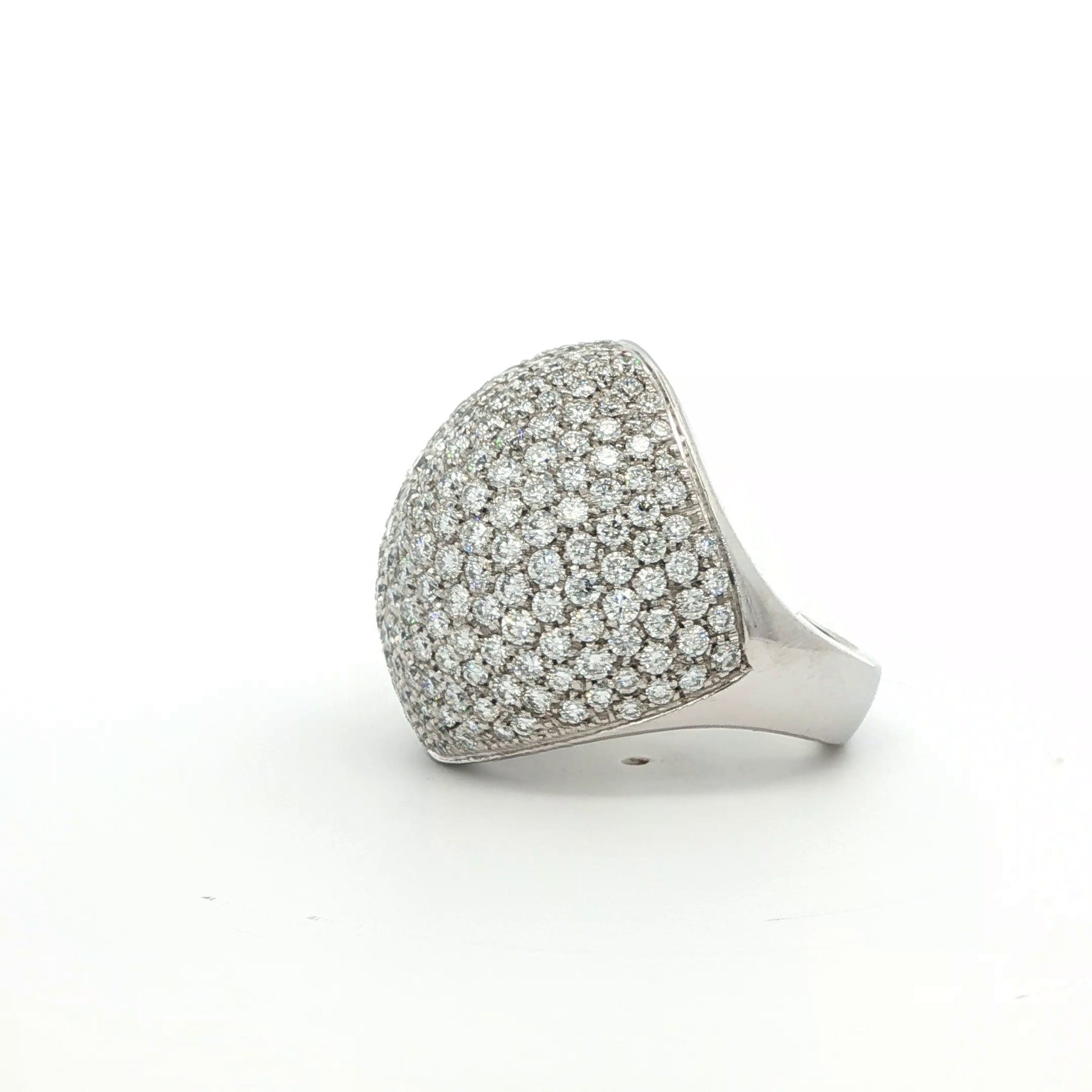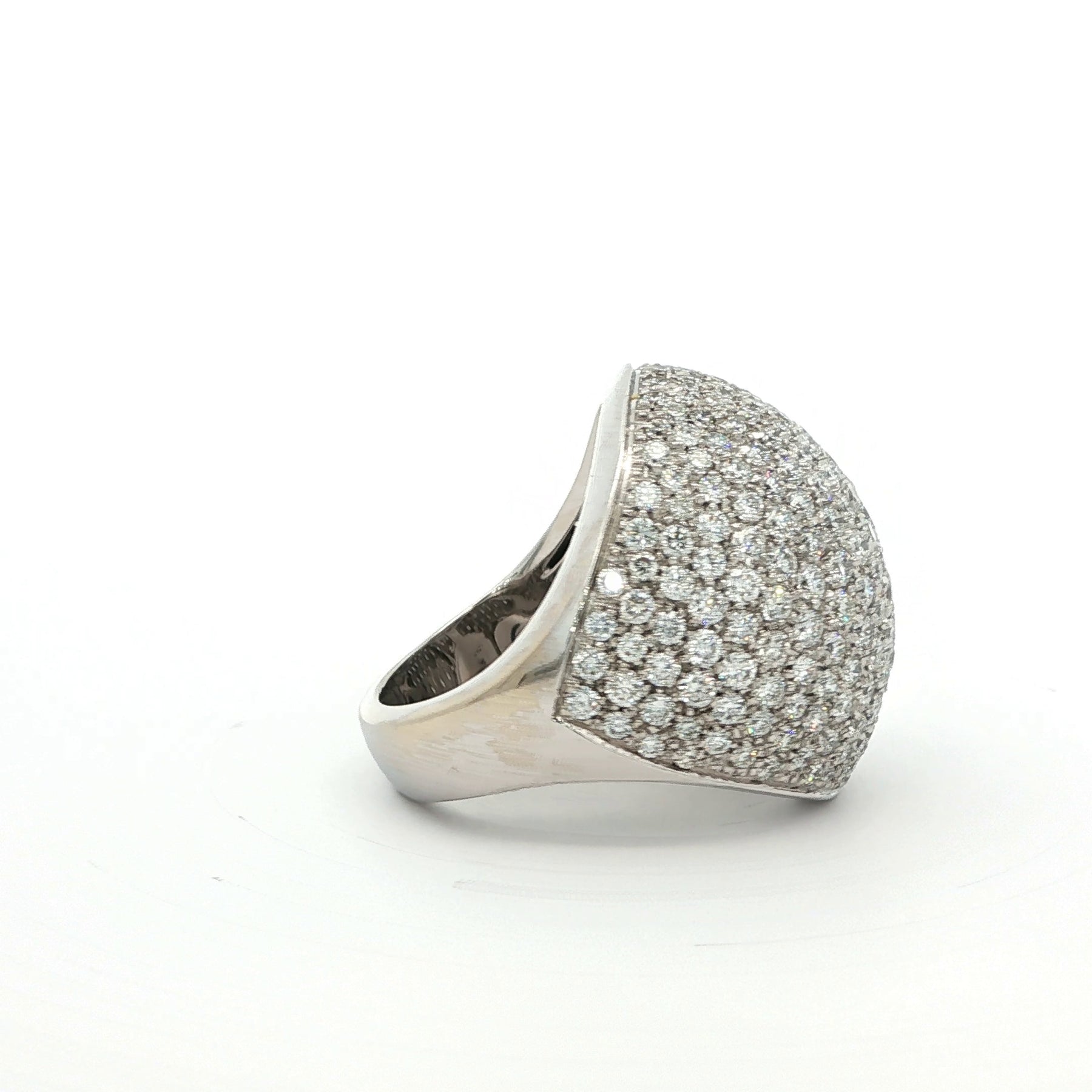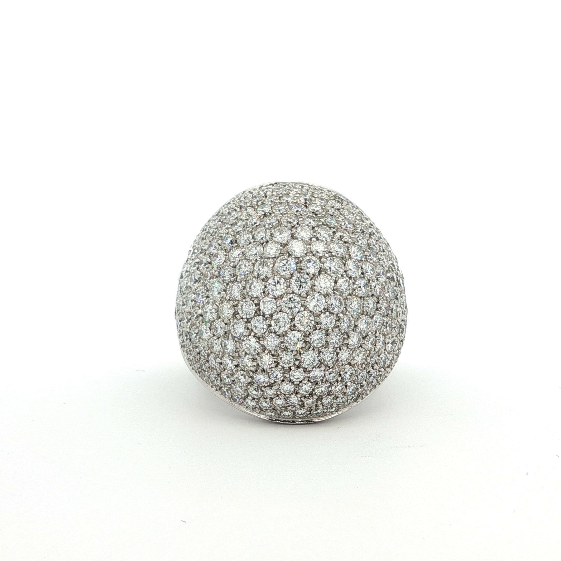 Krieger Pave Diamond Dome Ring in 18k White Gold. The ring features 4.69ctw of brilliant round diamonds. Ring size 7.25, weighs 18.8g.