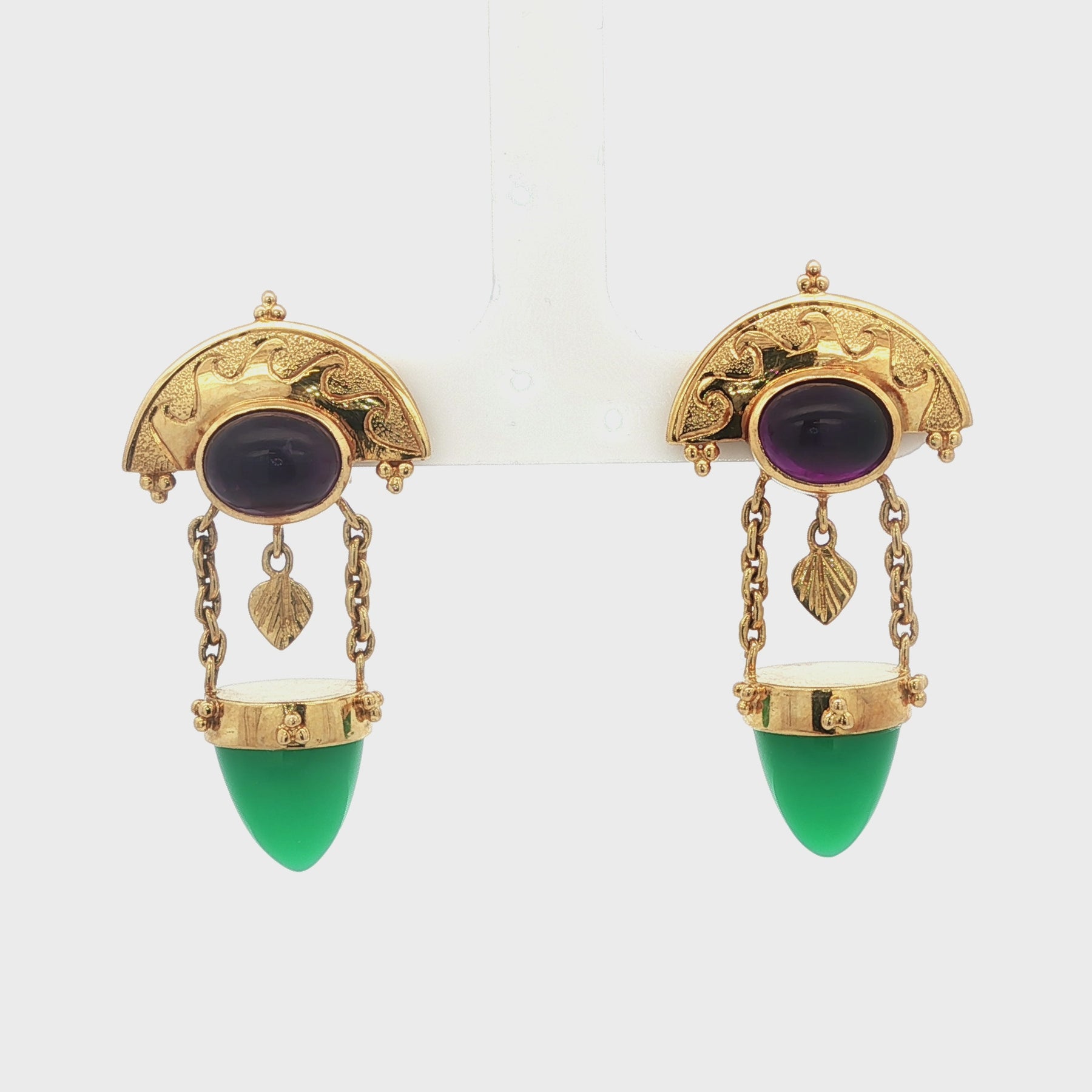 Estate Paula Crevoshay Amethyst & Chrysoprase Earrings in 18K Yellow Gold. The earrings approximately measure 1.5" by 0.80", and weigh 18 grams. Clip on.