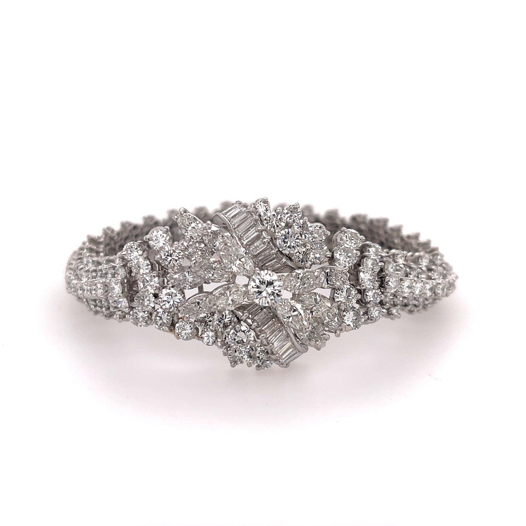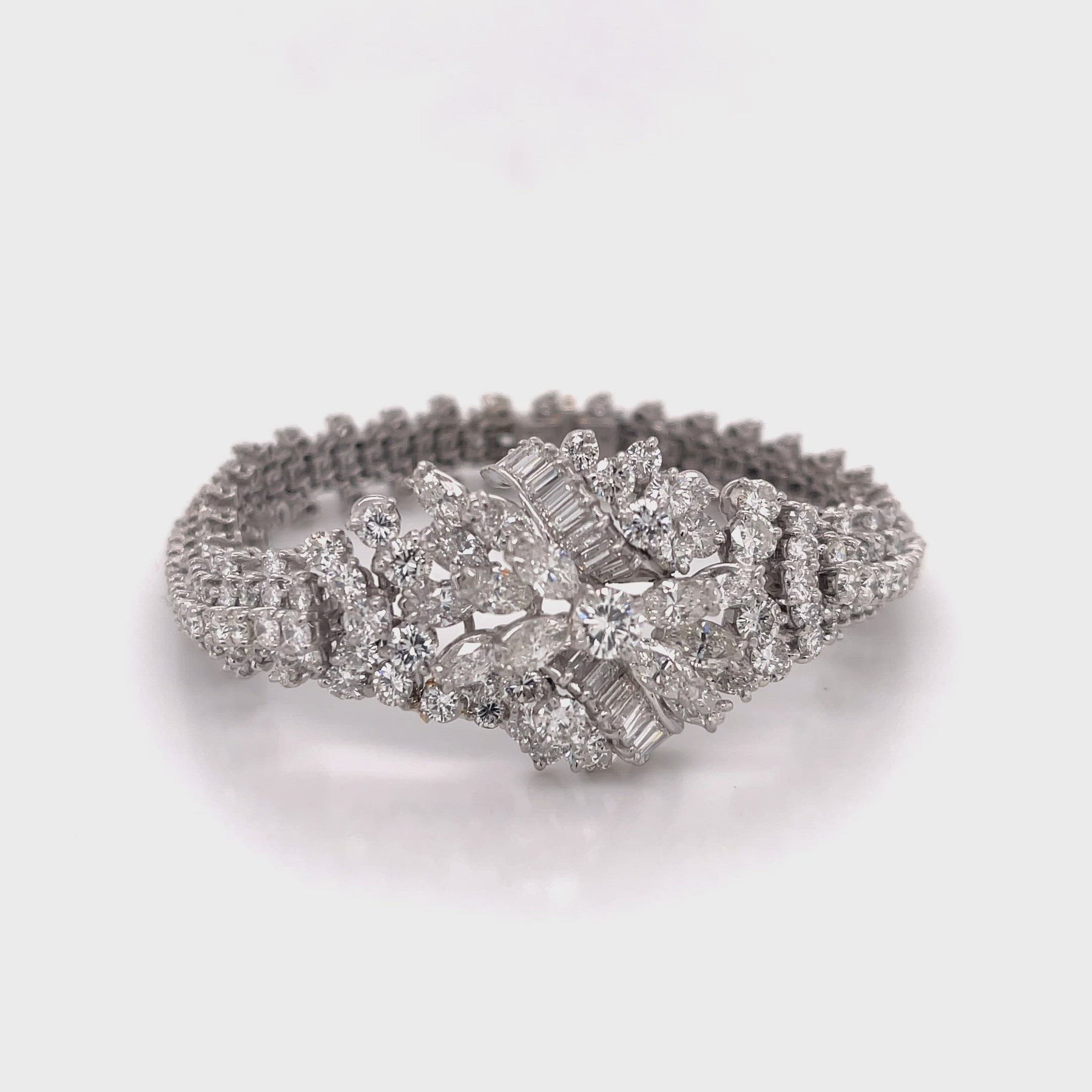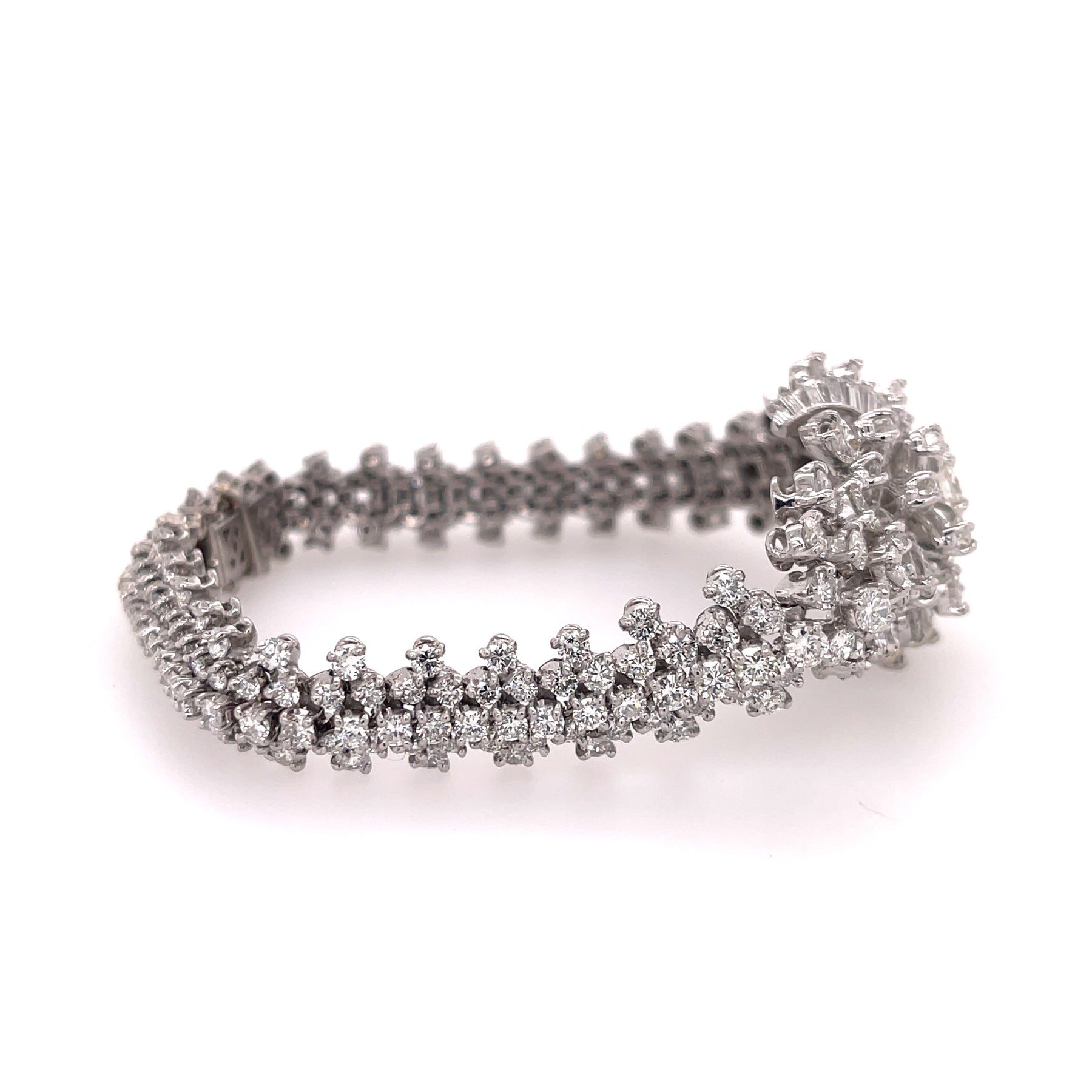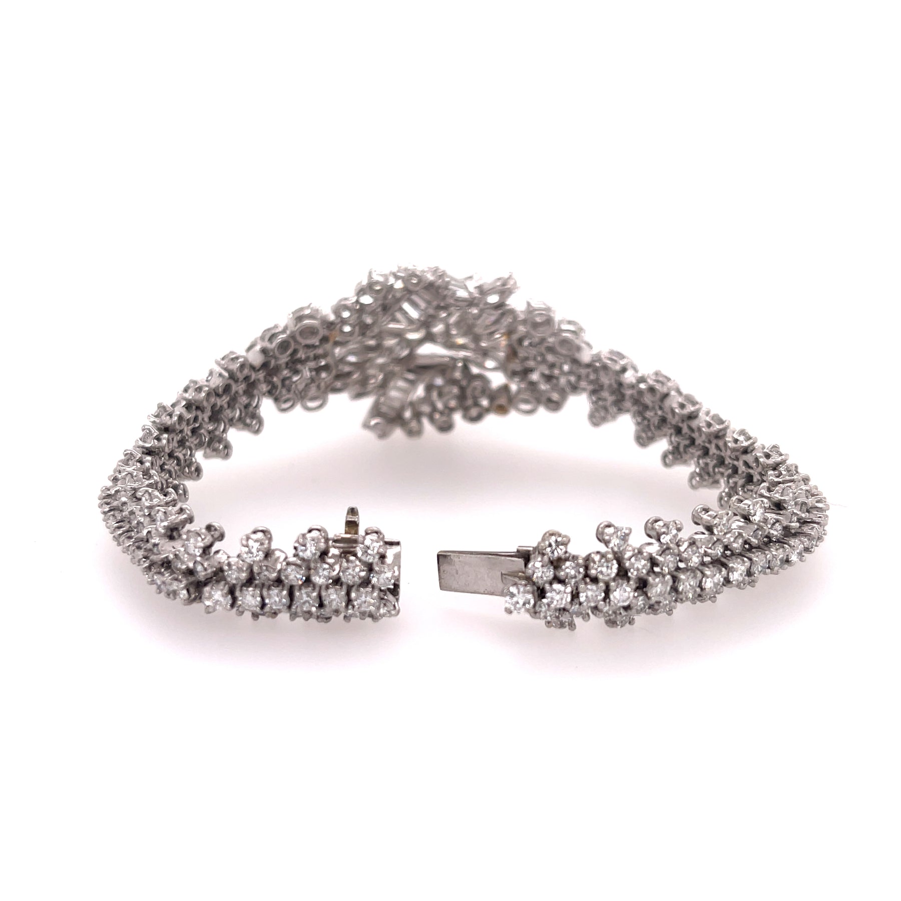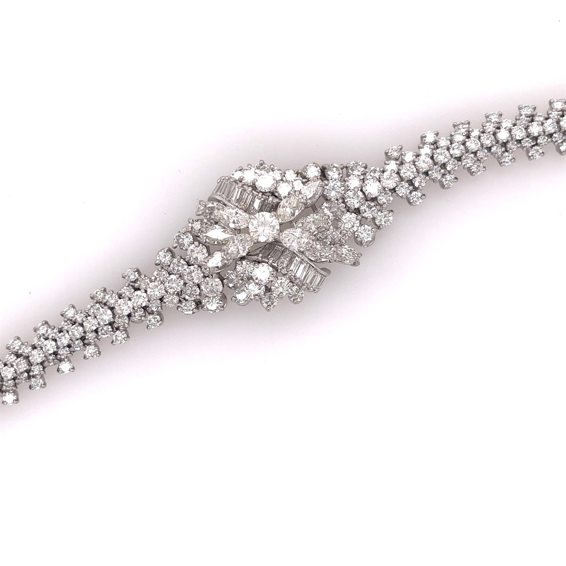 Estate diamond bracelet set in platinum. The bracelet features 17.15ctw of round, baguette, and oval diamonds.