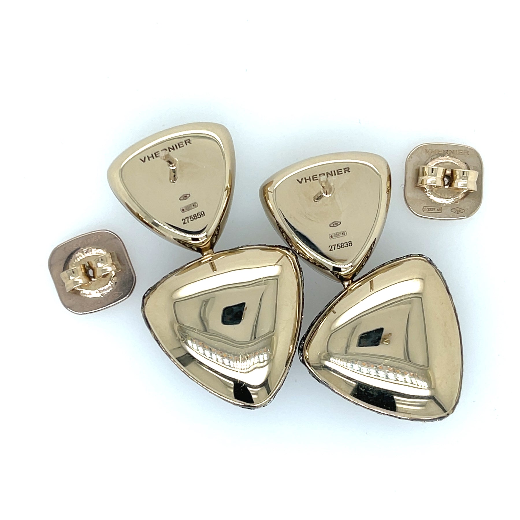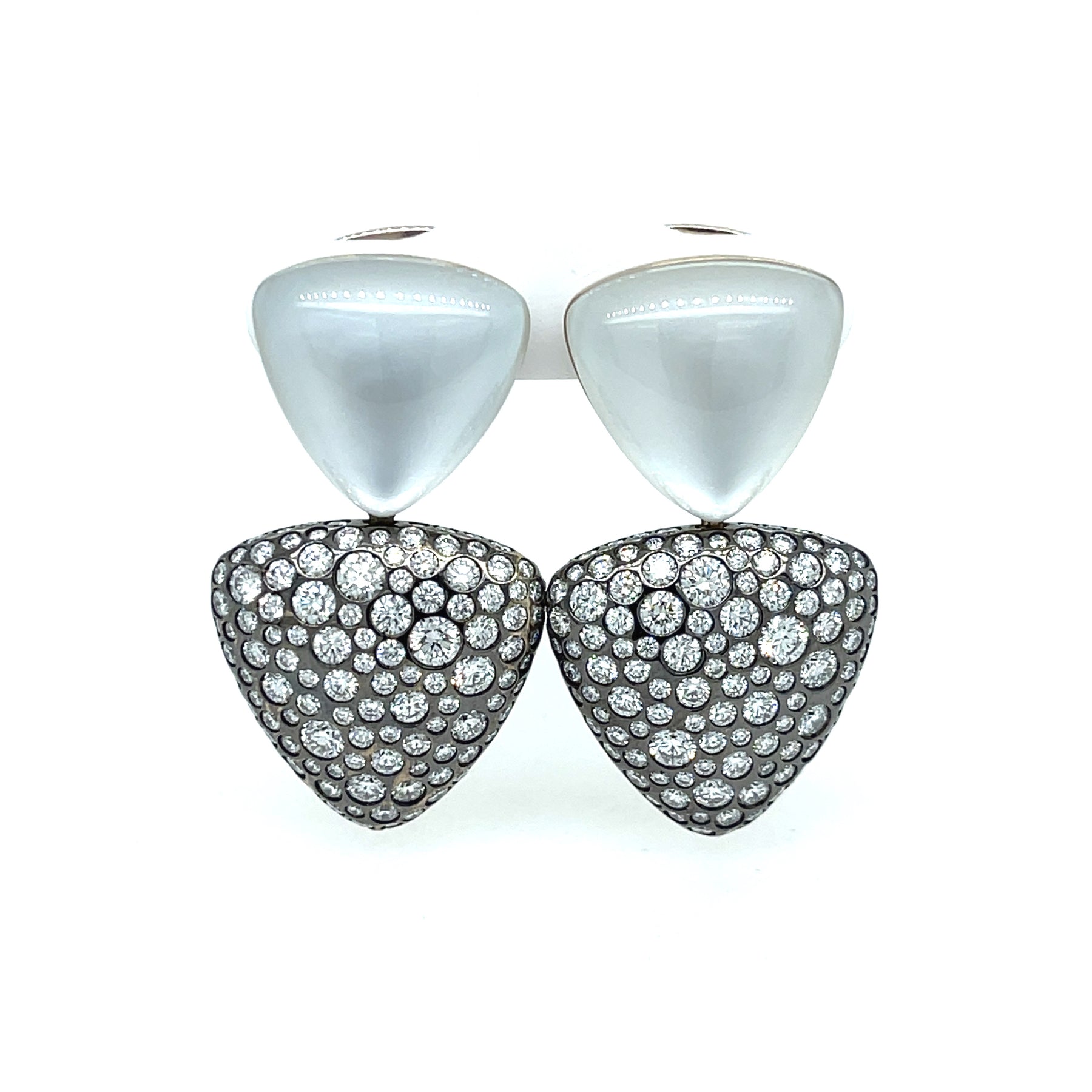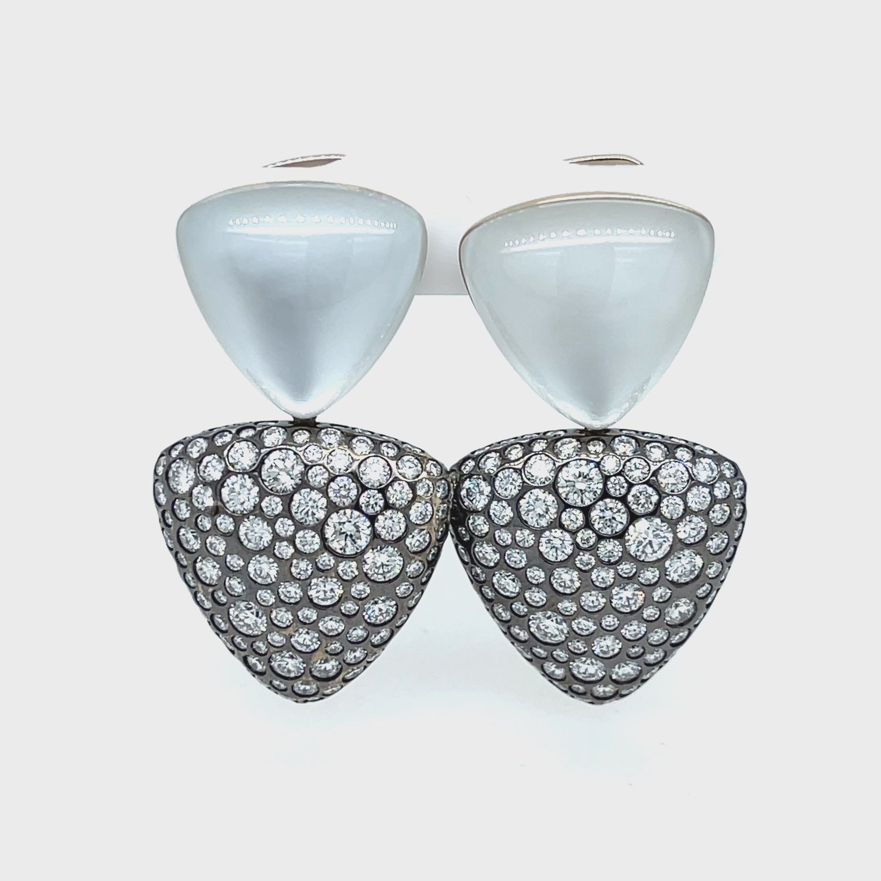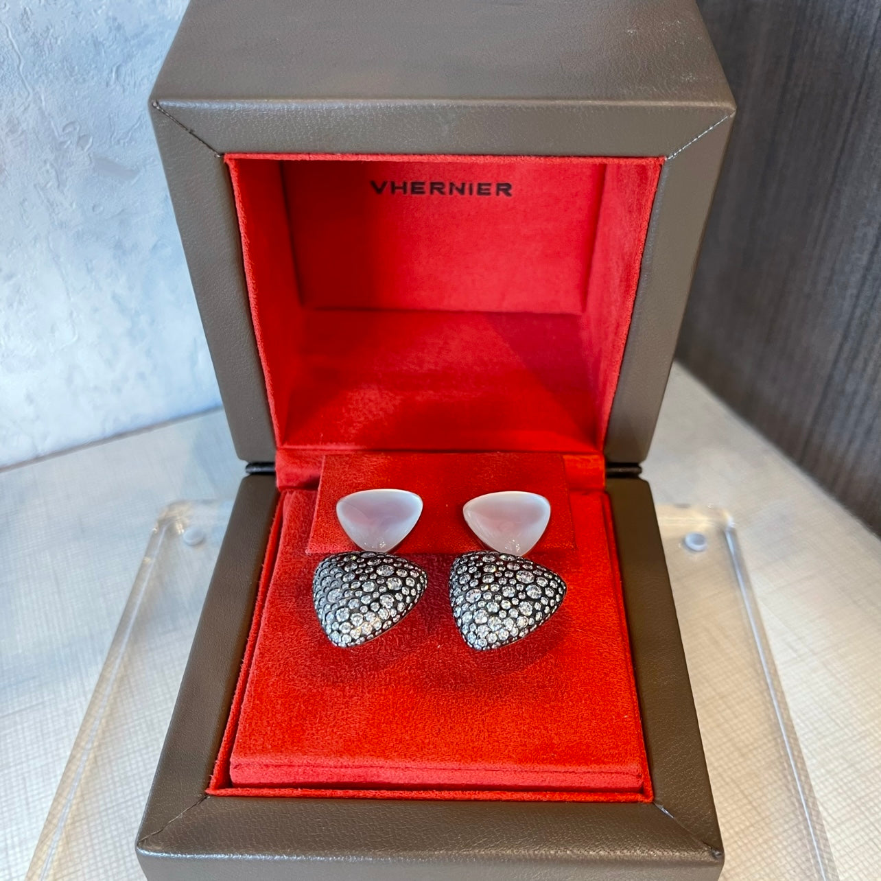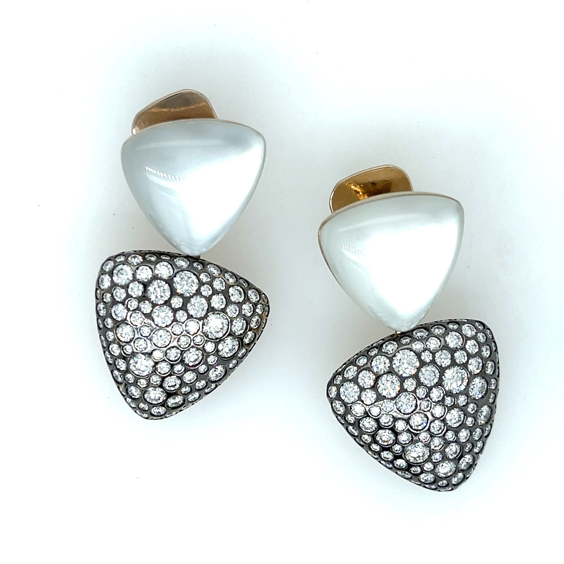 Estate Vhernier Diamond, Rock Crystal, & Mother of Pearl Earrings in 18K White Gold. The earrings feature approximately 4.46ctw of diamonds and rock crystal over mother of pearl.