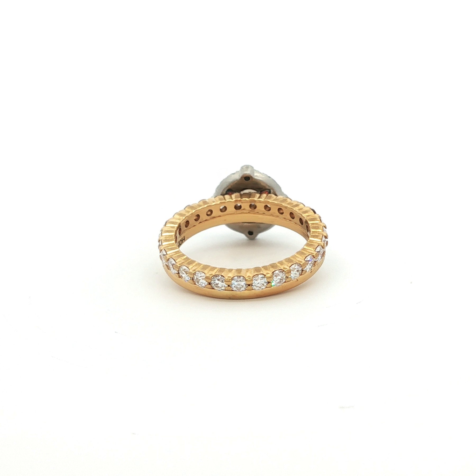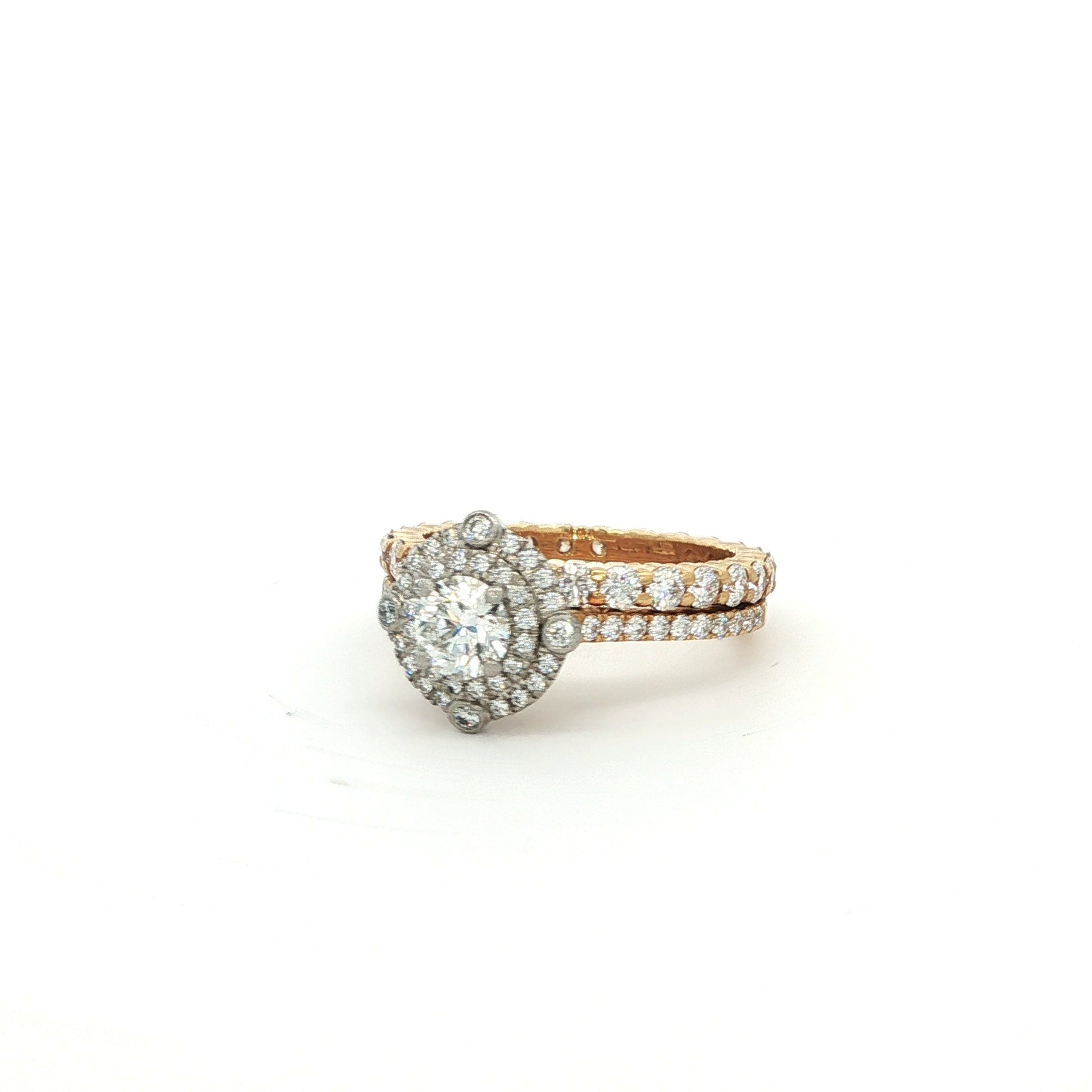 Hearts on Fire Diamond Wedding Ring Set 18K Yellow Gold. The engagement ring features a brilliant round center, accented by a double halo of diamonds. The set includes a brilliant round diamond eternity band. Both rings a ring size 7, and have a total weight if 7.6 grams.