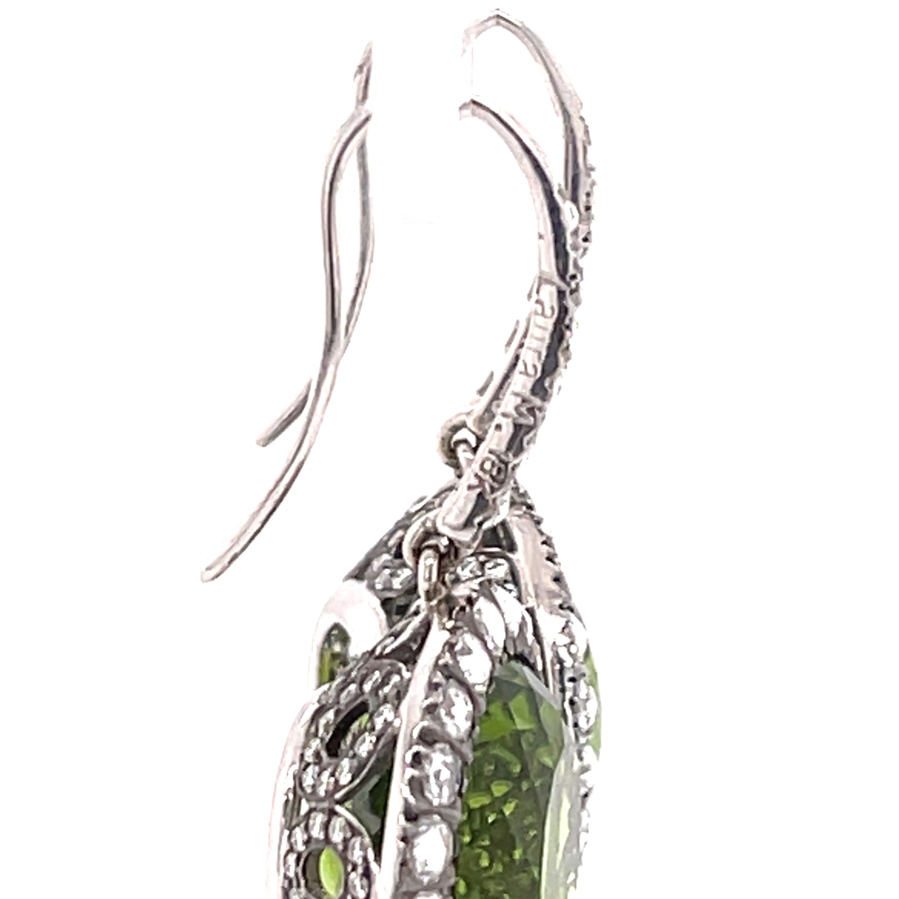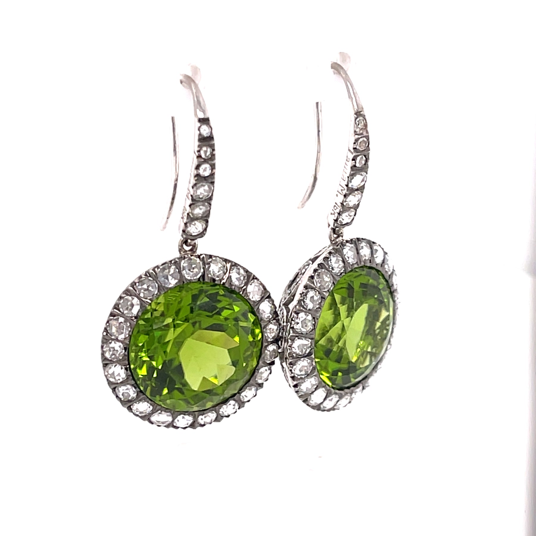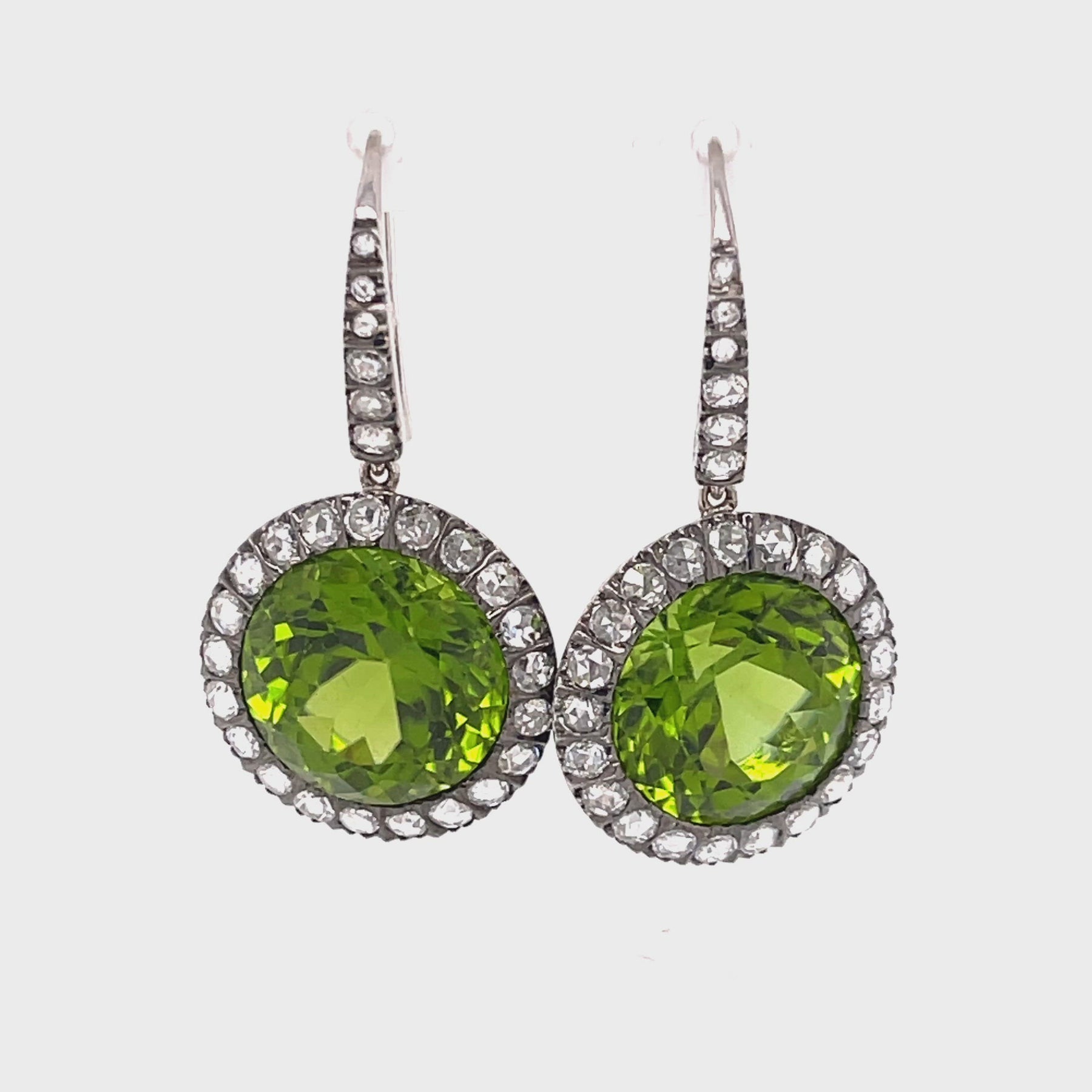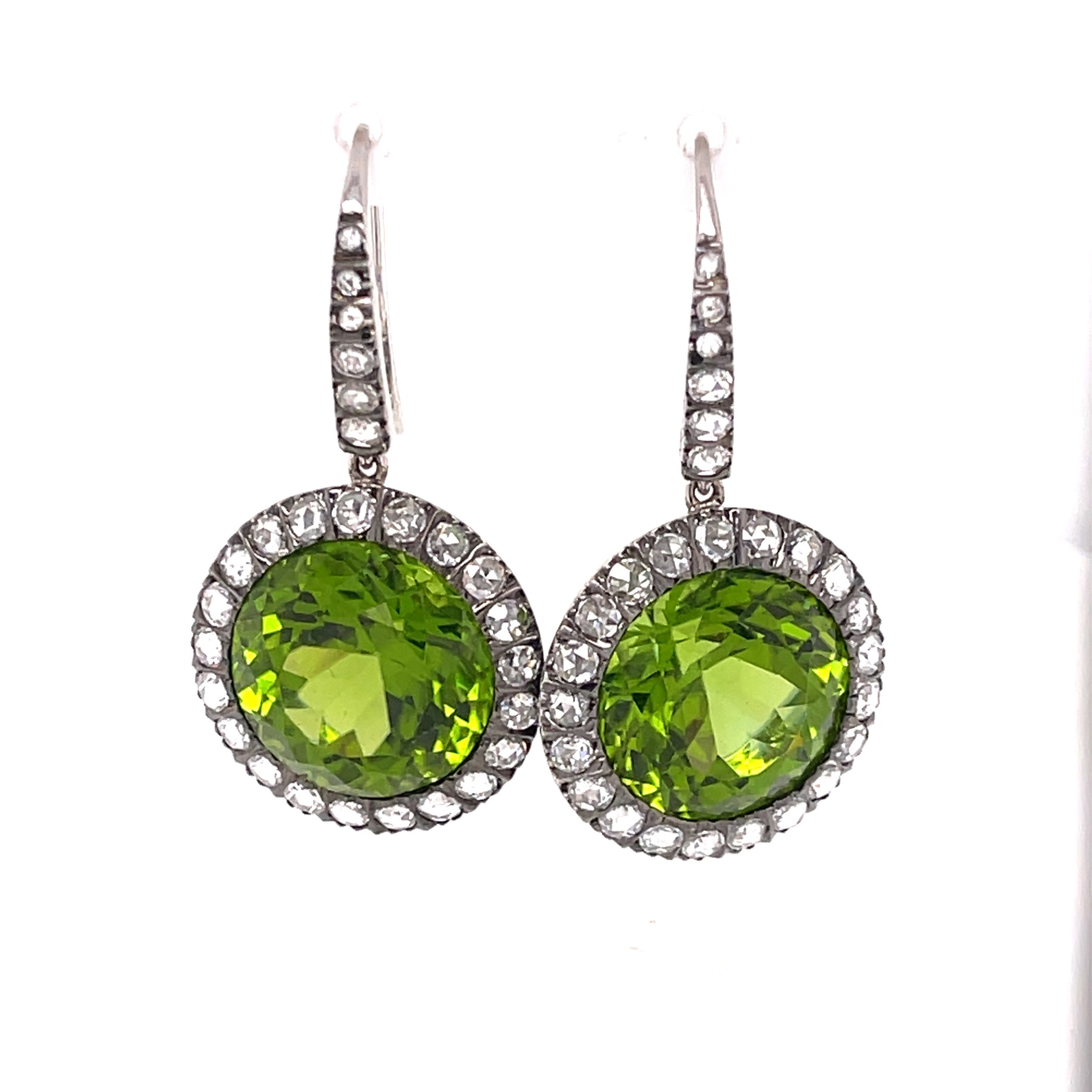 Gorgeous 18K Peridot and White Gold Earrings with Diamonds. These phenomenal earrings are drop earrings for pierced ears.  Round Faceted Peridot (21CTW)!