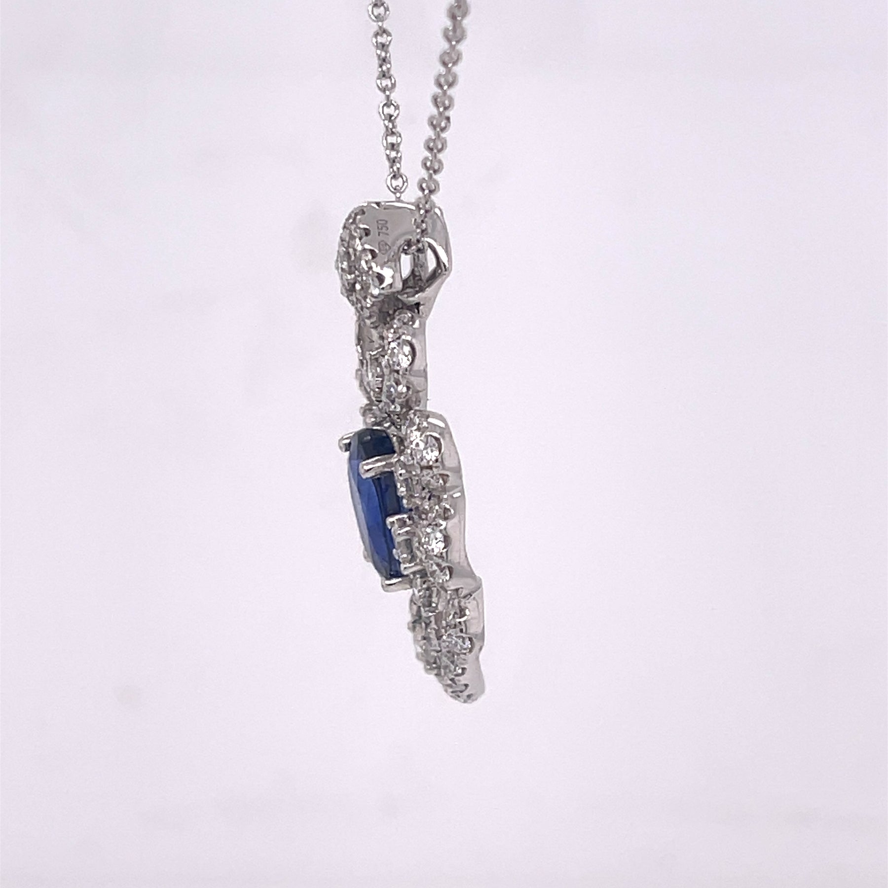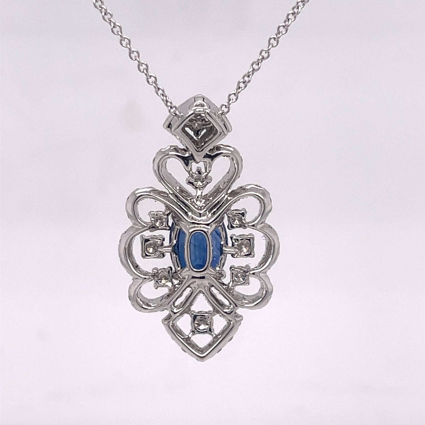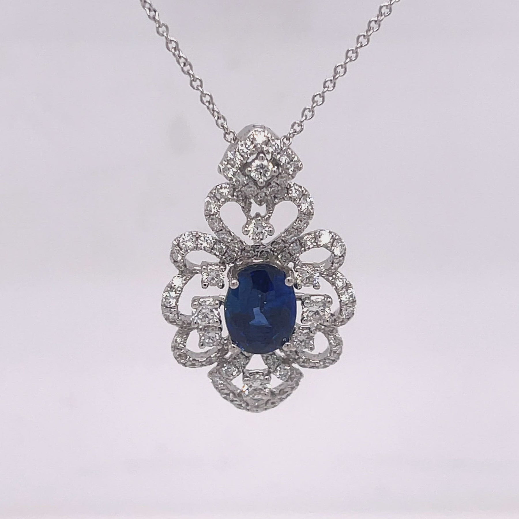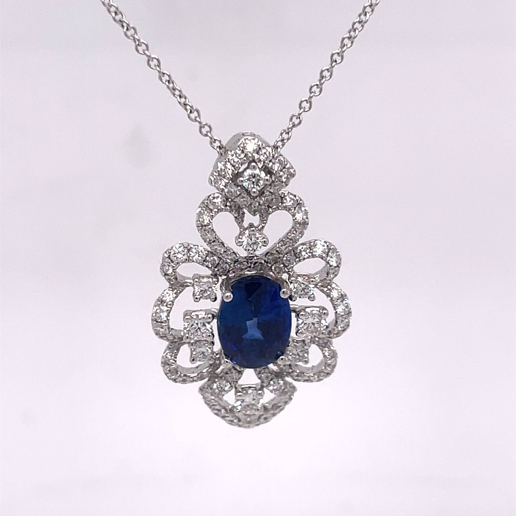 Ornate pendant necklace featuring an oval 3.04ct sapphire and 1.37ctw of diamonds. Set in 18K white gold and on a 18 inch chain. Stamped 18K 750 D1.37 S3.04. Pendant measures 1.25"L x 0.75"W