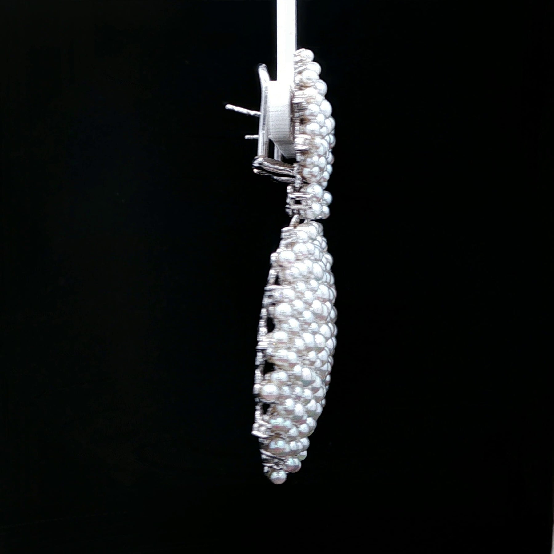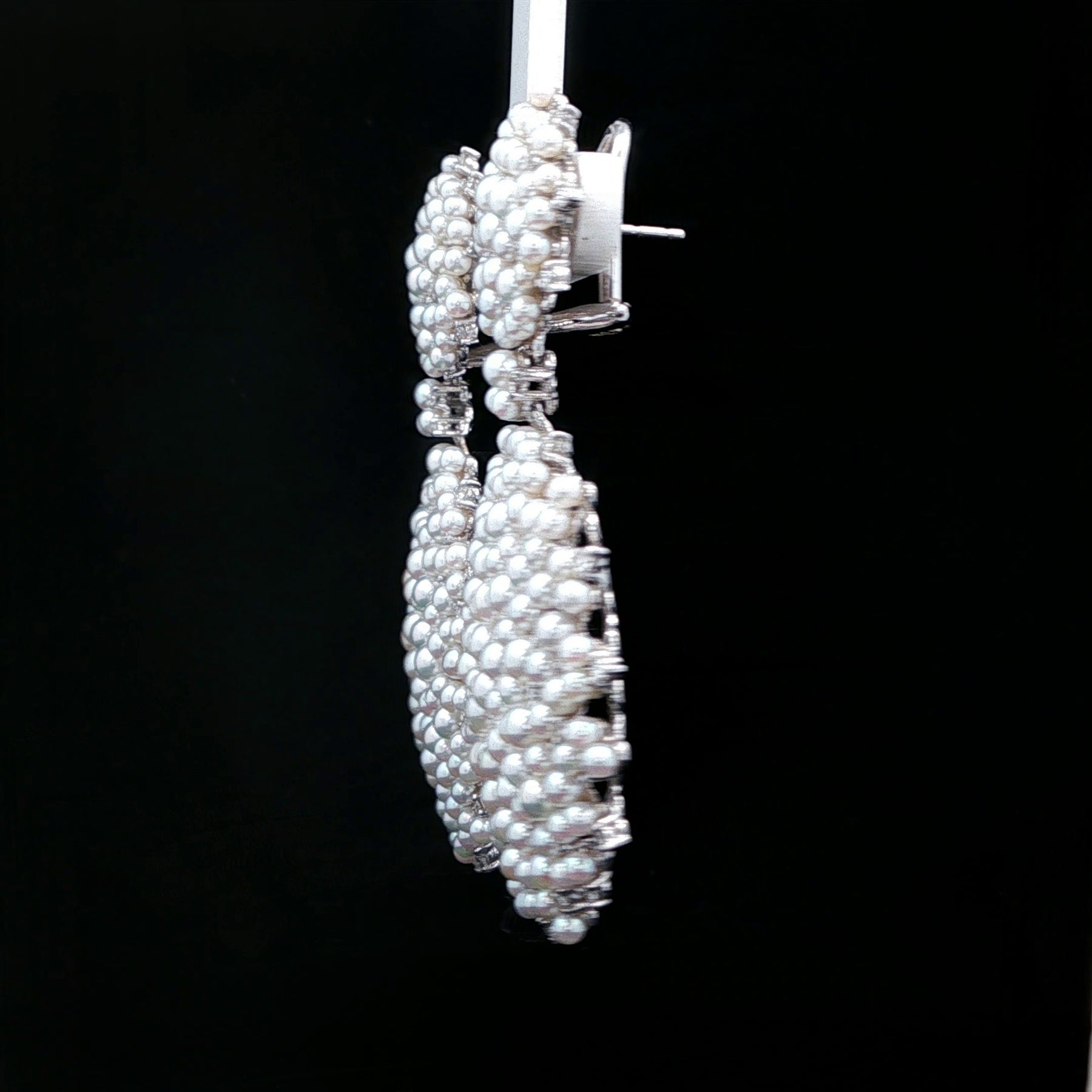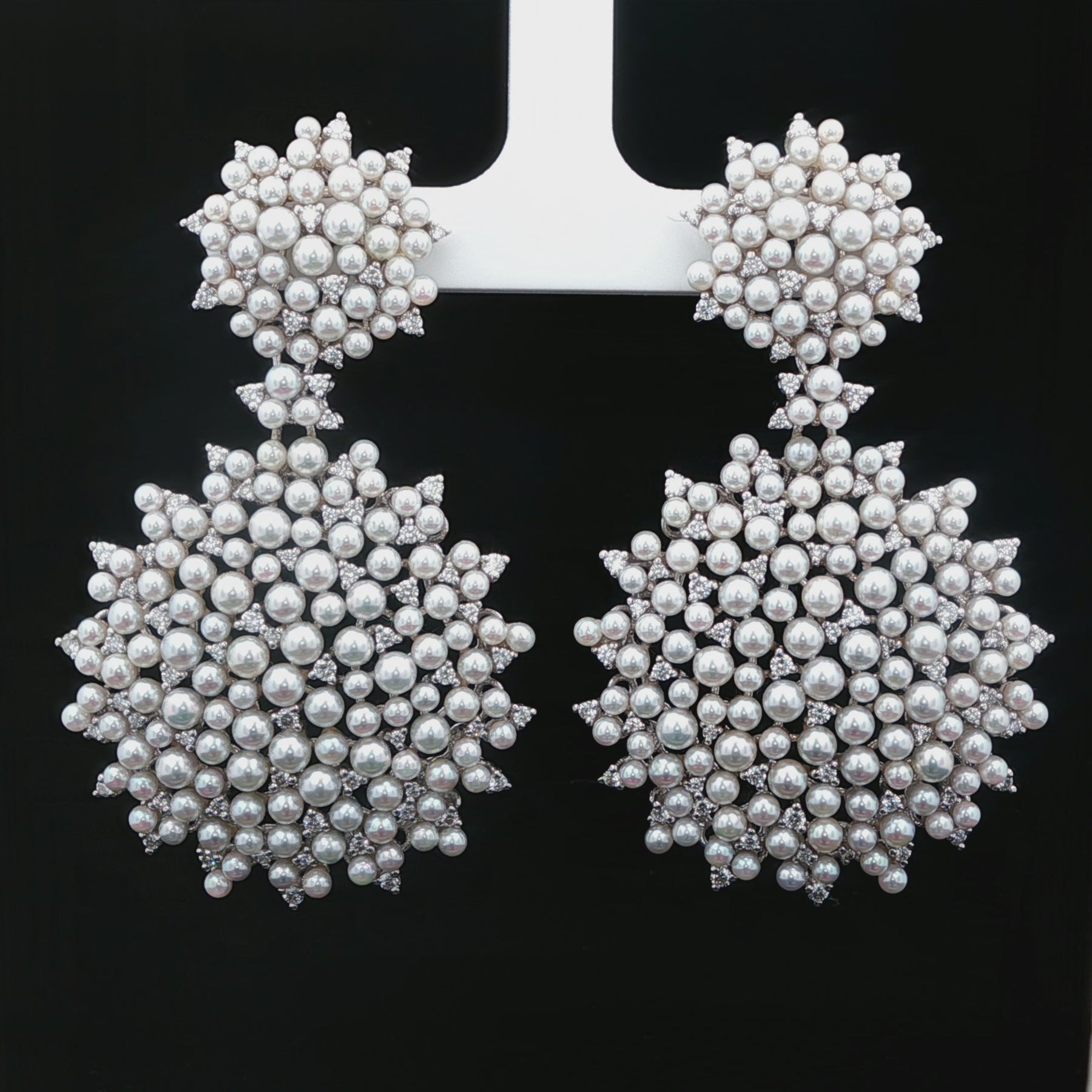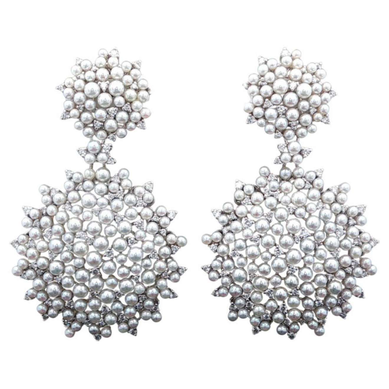 Paul Morelli Lagrange Pearl & Diamond Earrings in 18K White Gold. The dangle earrings feature white akoya pearls accented by 1.97ctw of brilliant round diamonds. Post and clip backs. The earrings weigh 30.6 grams, 2.25" long, and 1.5" at widest point. Normal retail is $28,000!