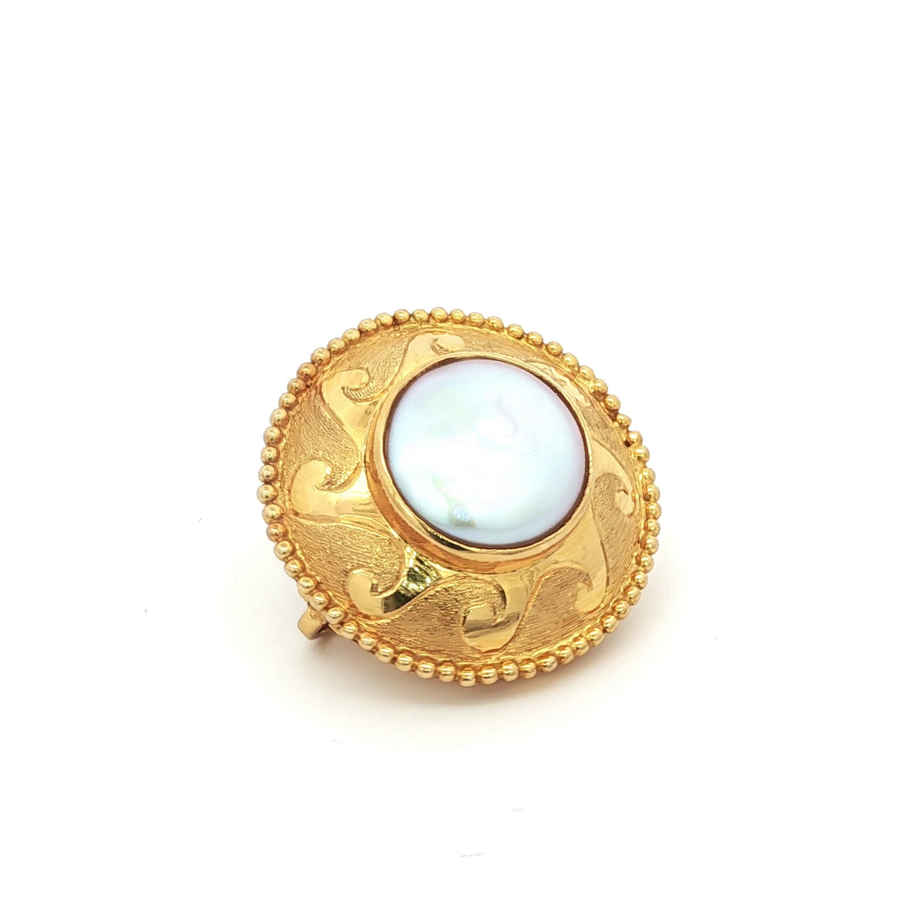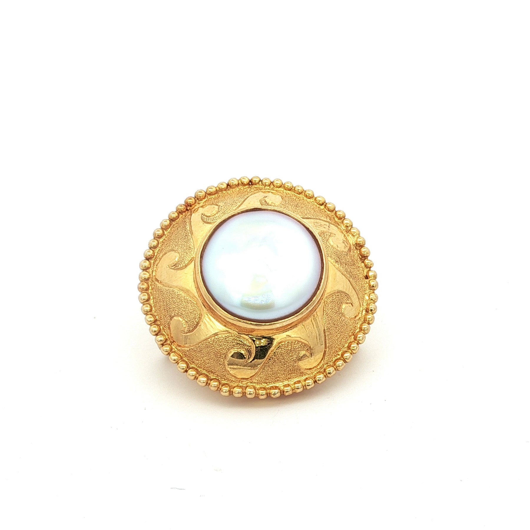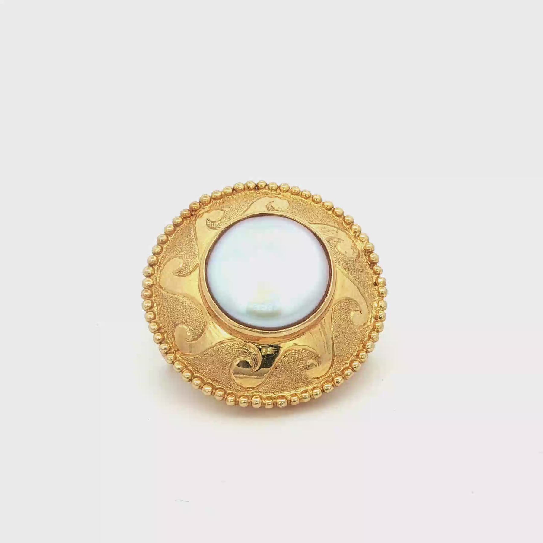 Estate Paula Crevoshay Mabe Pearl Pendant/Brooch in 18K Yellow Gold. Can be worn as a brooch or slide pendant. 26mm wide and weighs 13.5 grams.