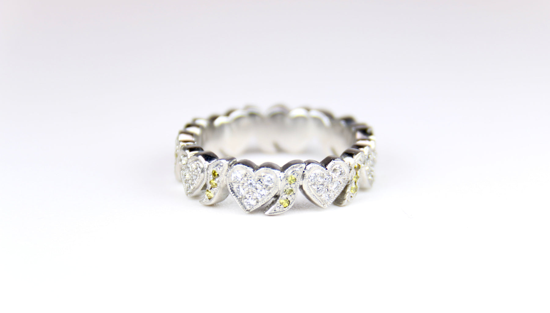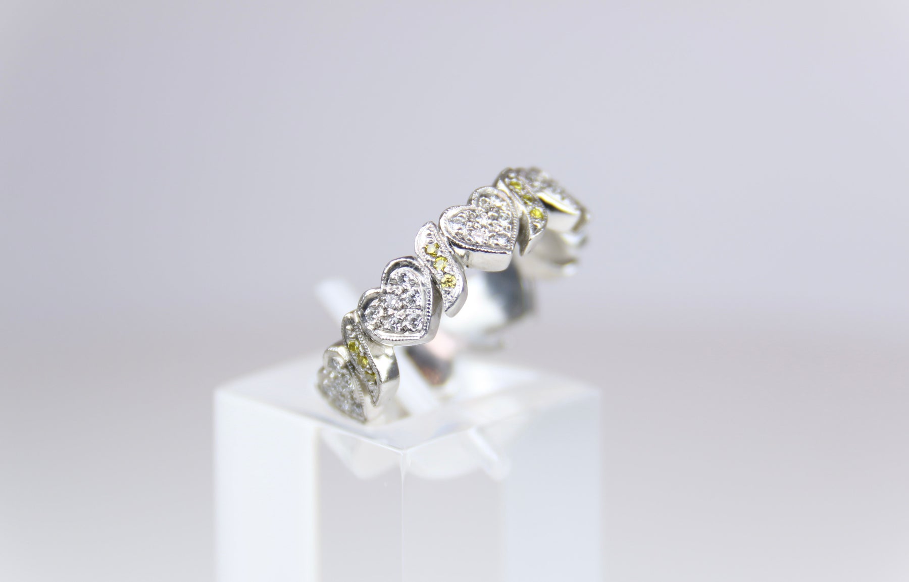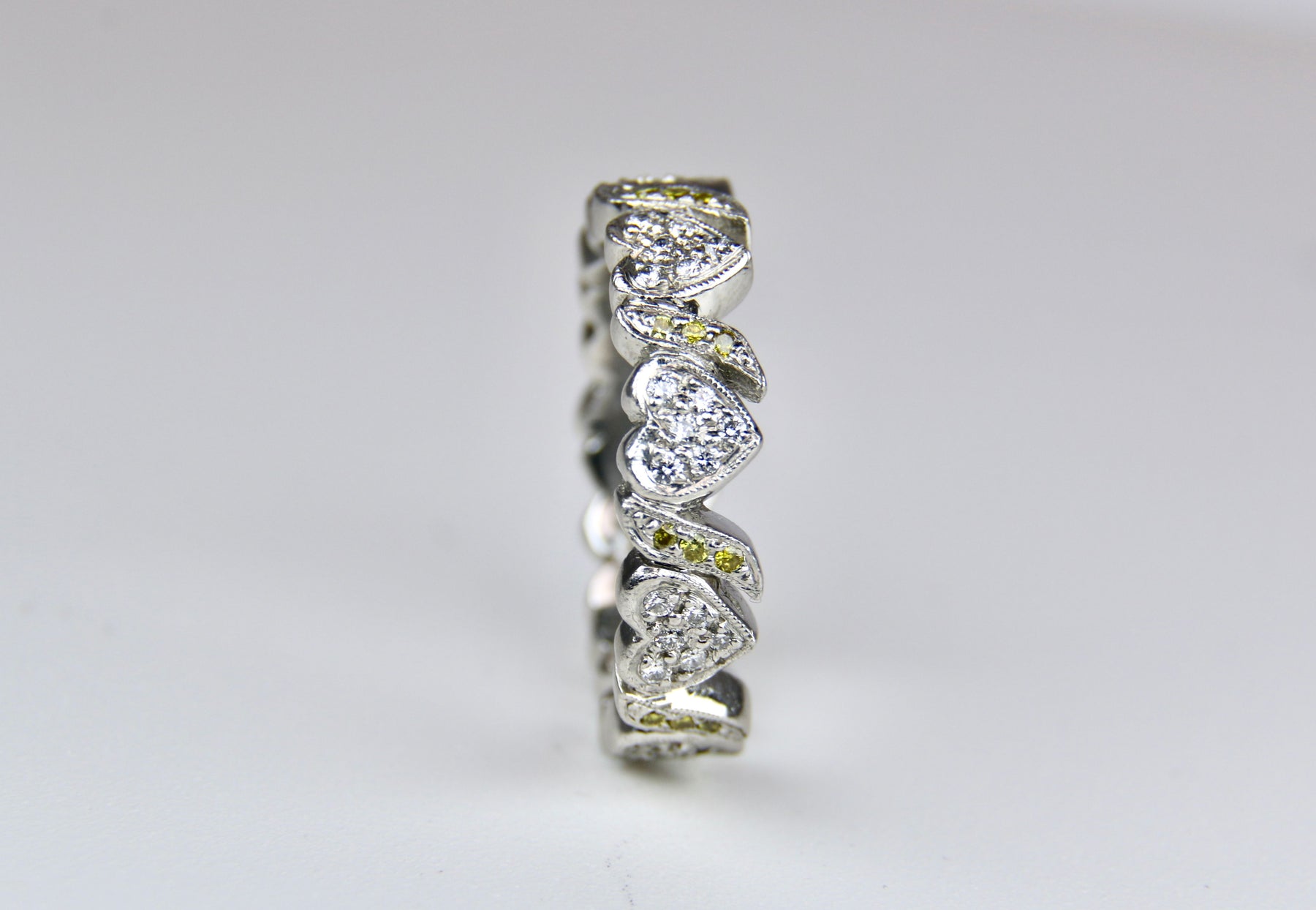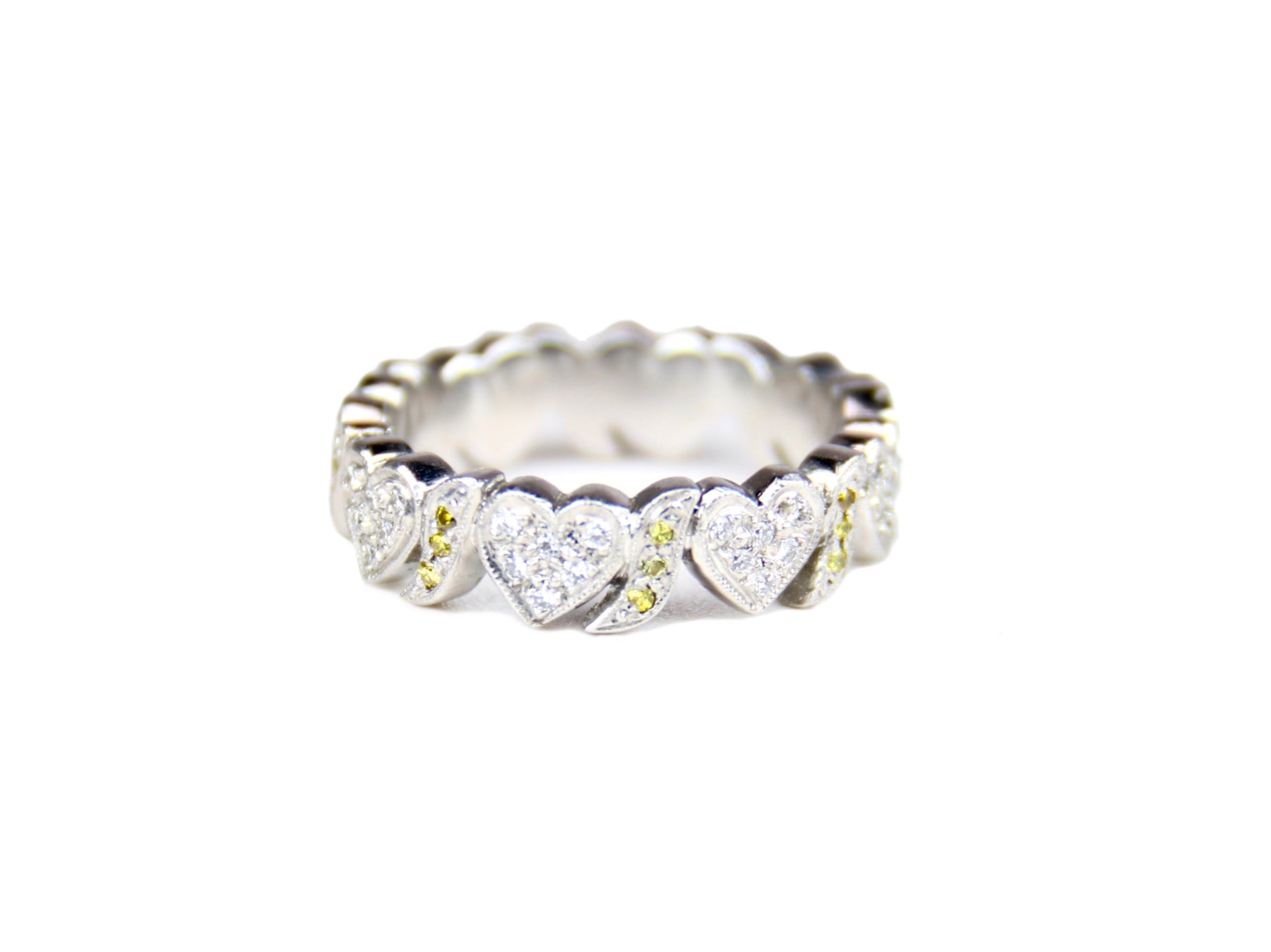 This gorgeous eternity band of diamonds says I love you with a beautiful platinum band of hearts stack this with a wedding ring or wear it alone, either way this piece is sure to please.