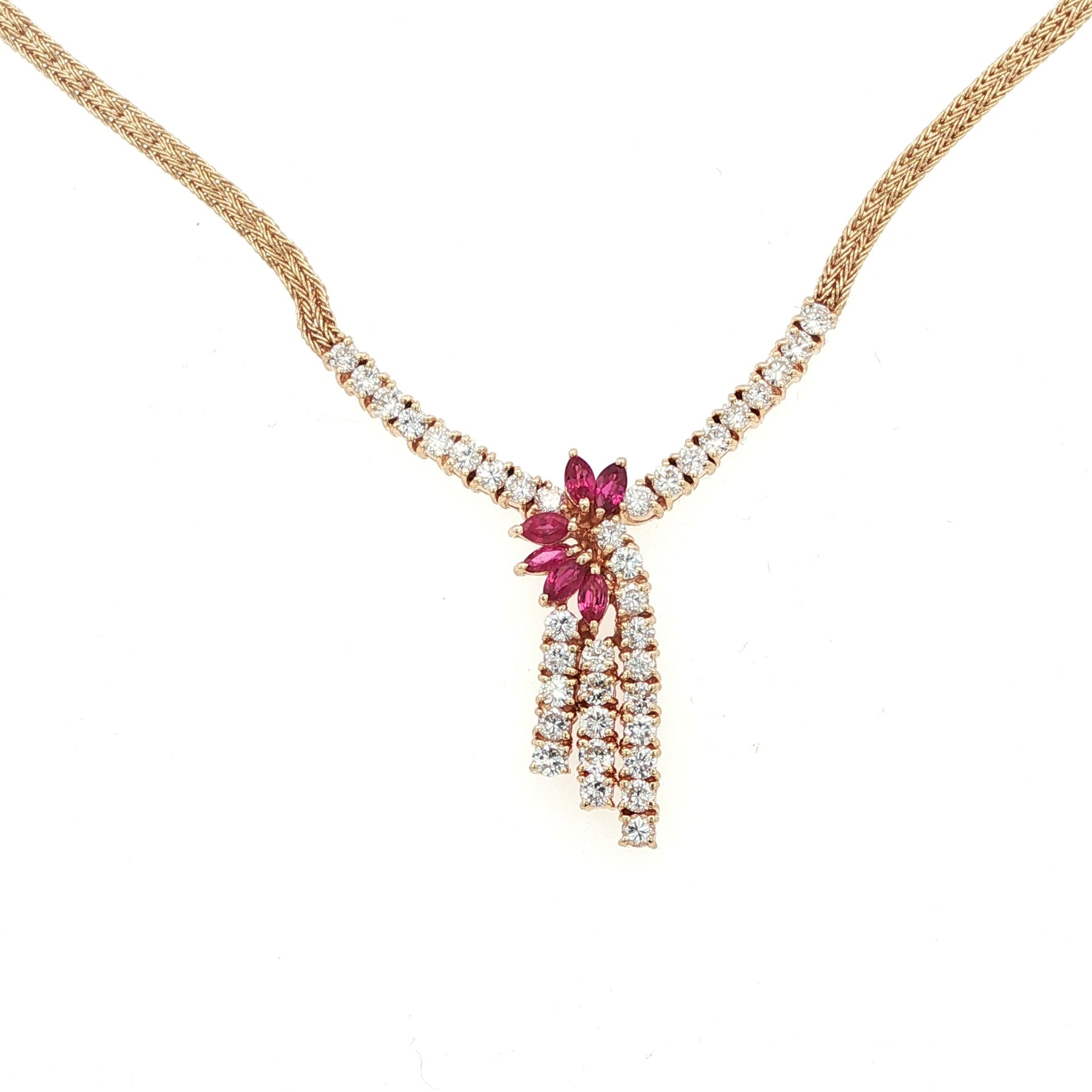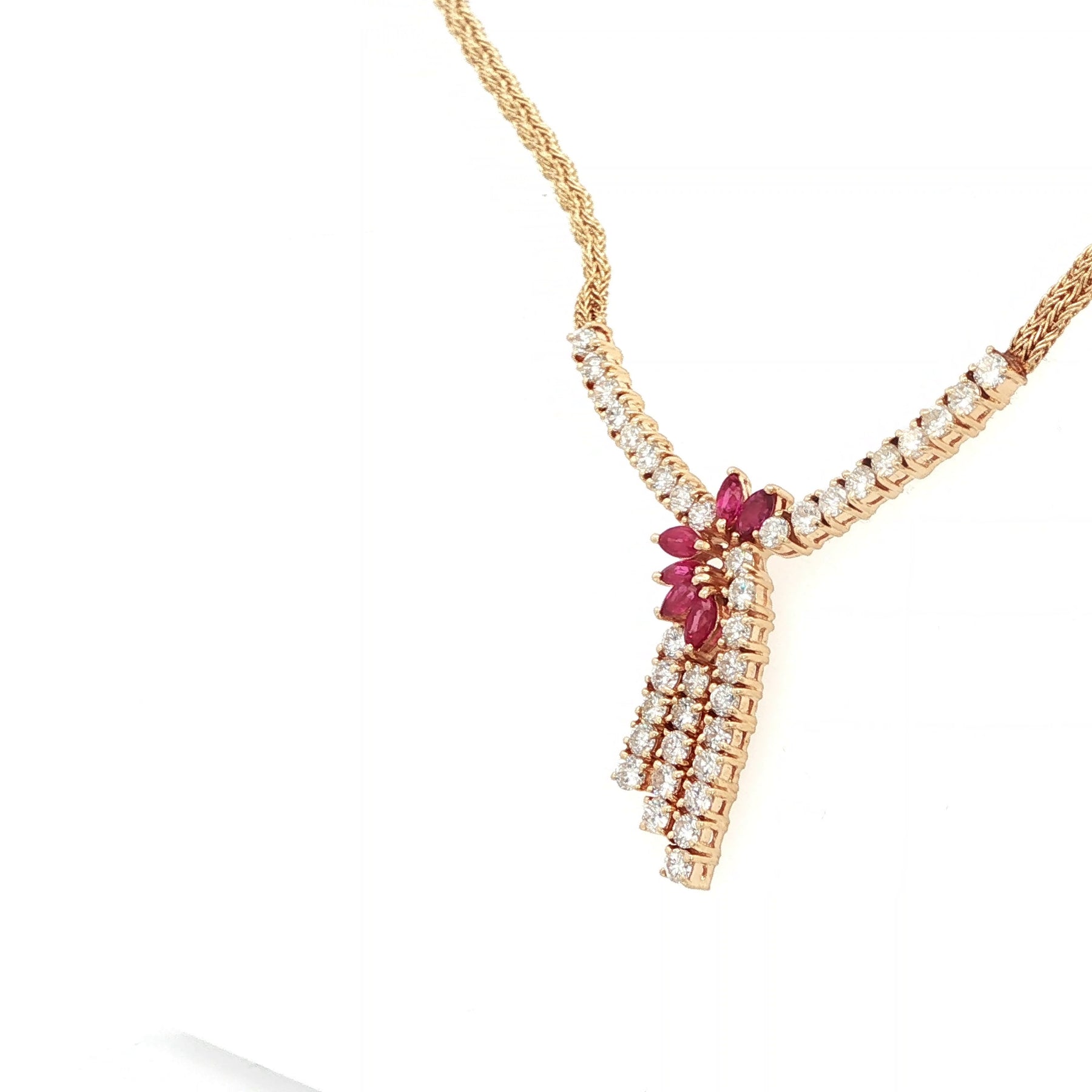Ruby & Diamond Waterfall Necklace 14K Yellow Gold. The necklace features 0.78cte of marquise cut rubies, and 2.50ctw of brilliant round diamonds ( H color, SI2 clarity). The necklace is approximately 16 inches long and weighs 1.5 grams.
