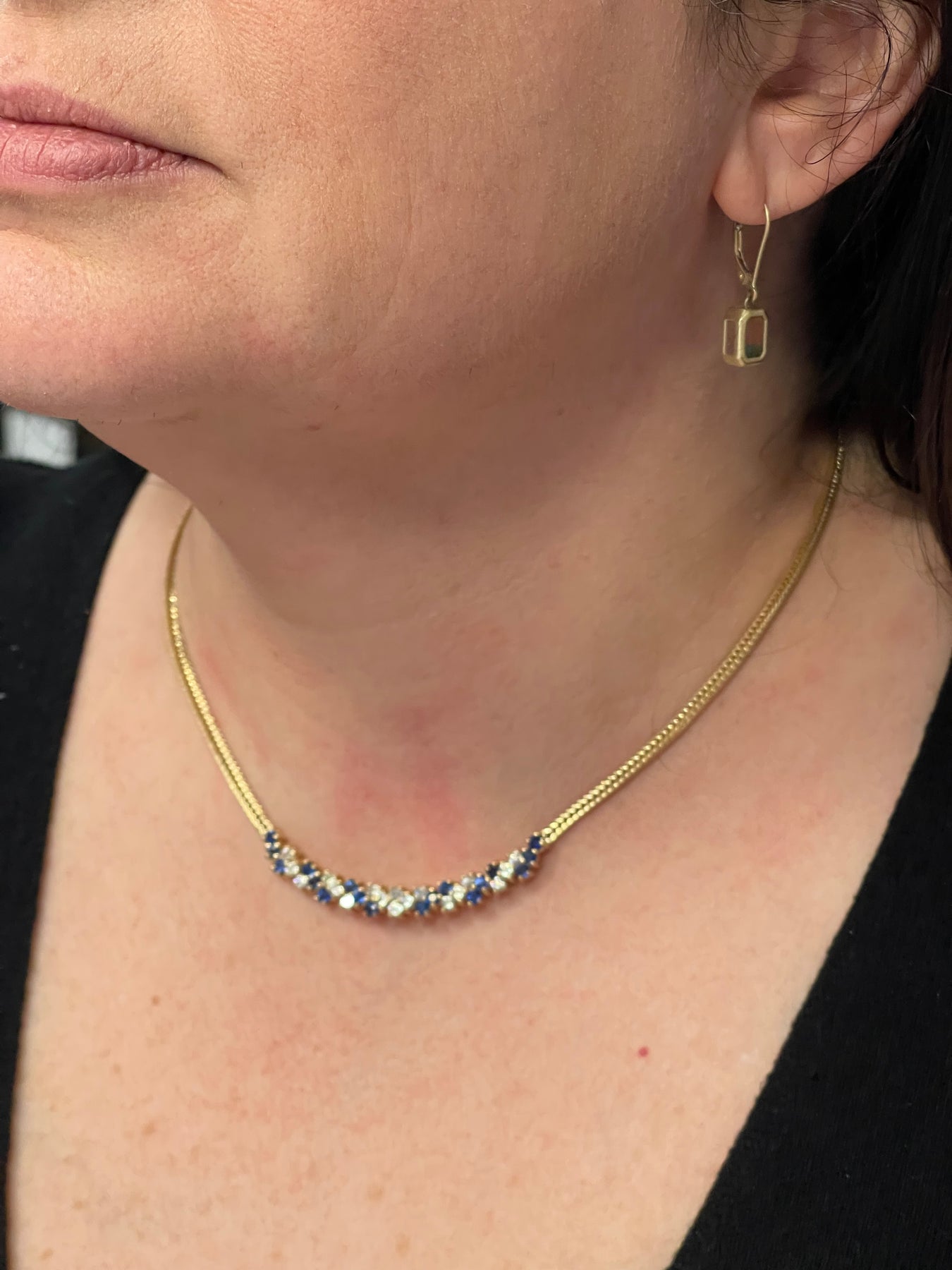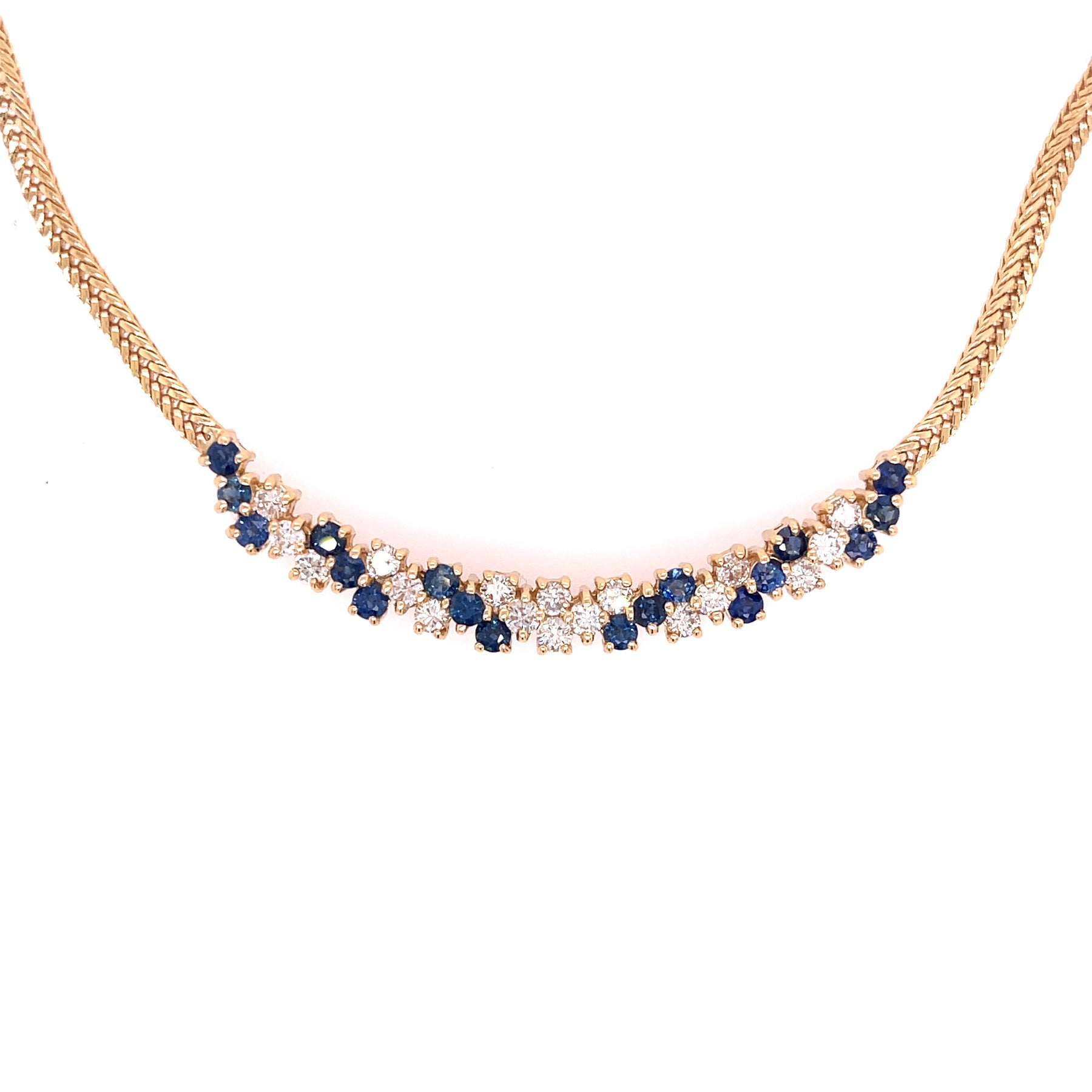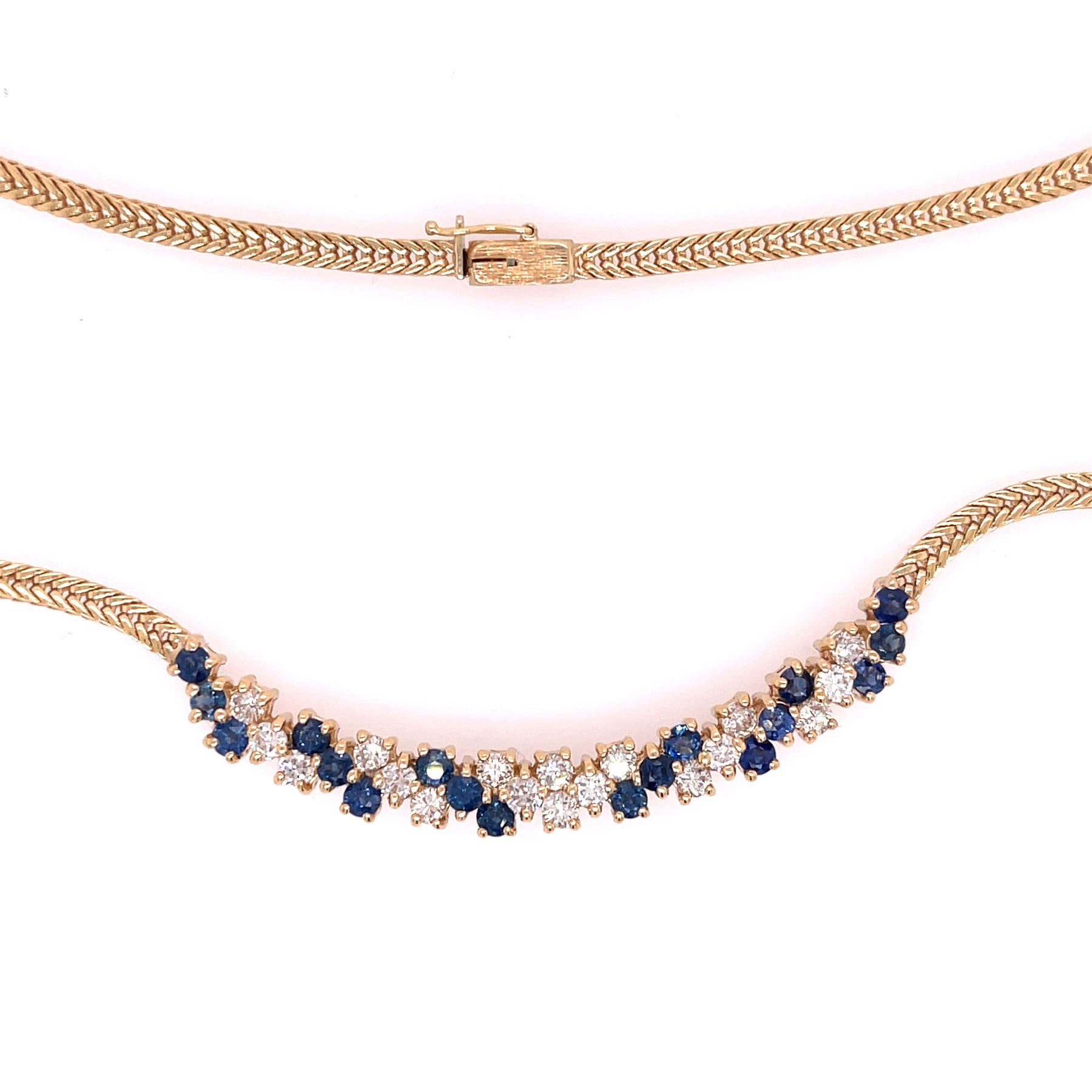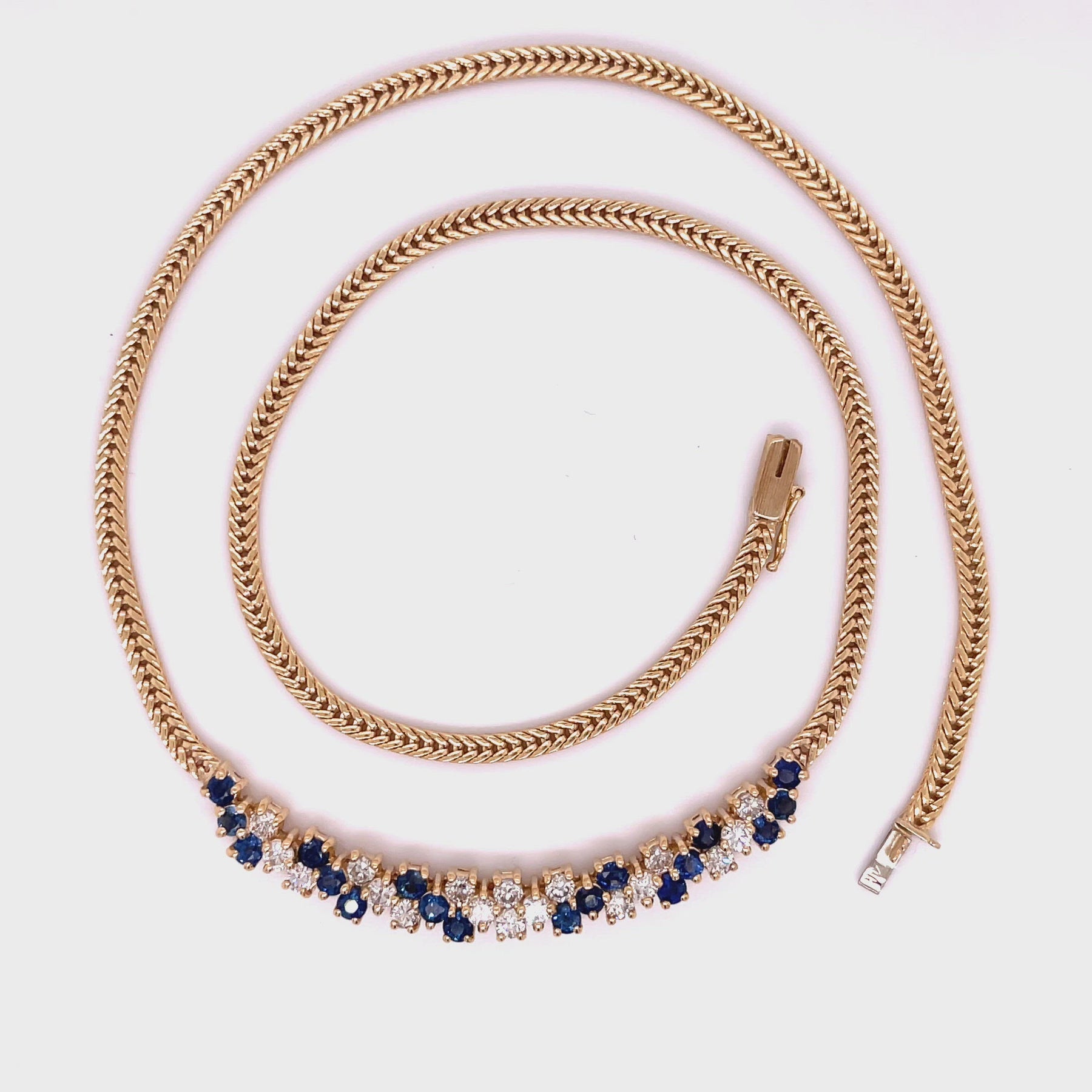 Estate Sapphire and diamond necklace in 14k yellow gold. The necklace features approximately 1.25ctw of diamonds and 1.30ctw of sapphires.