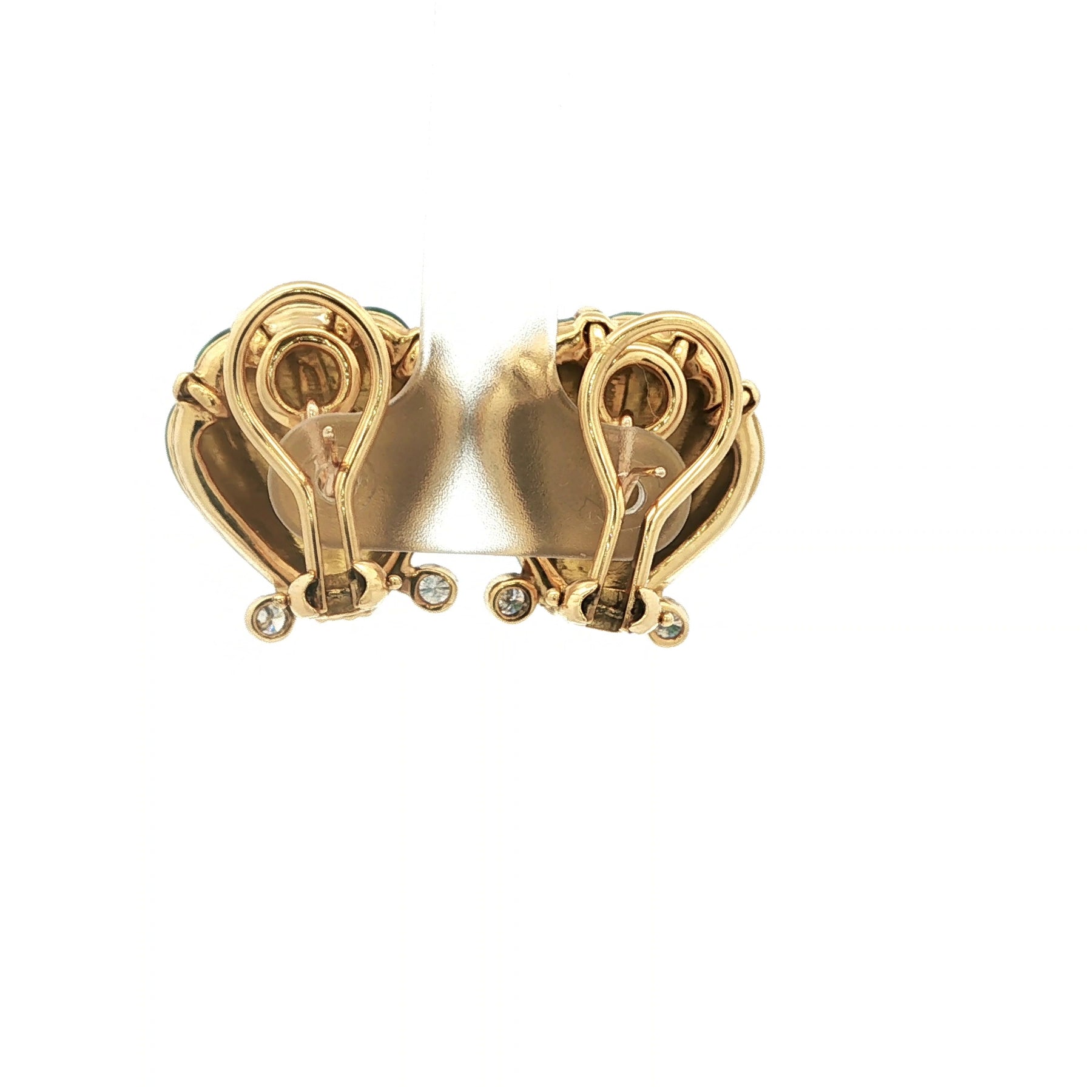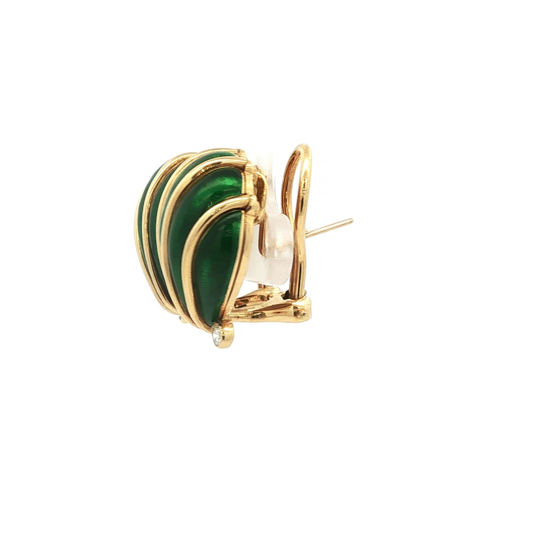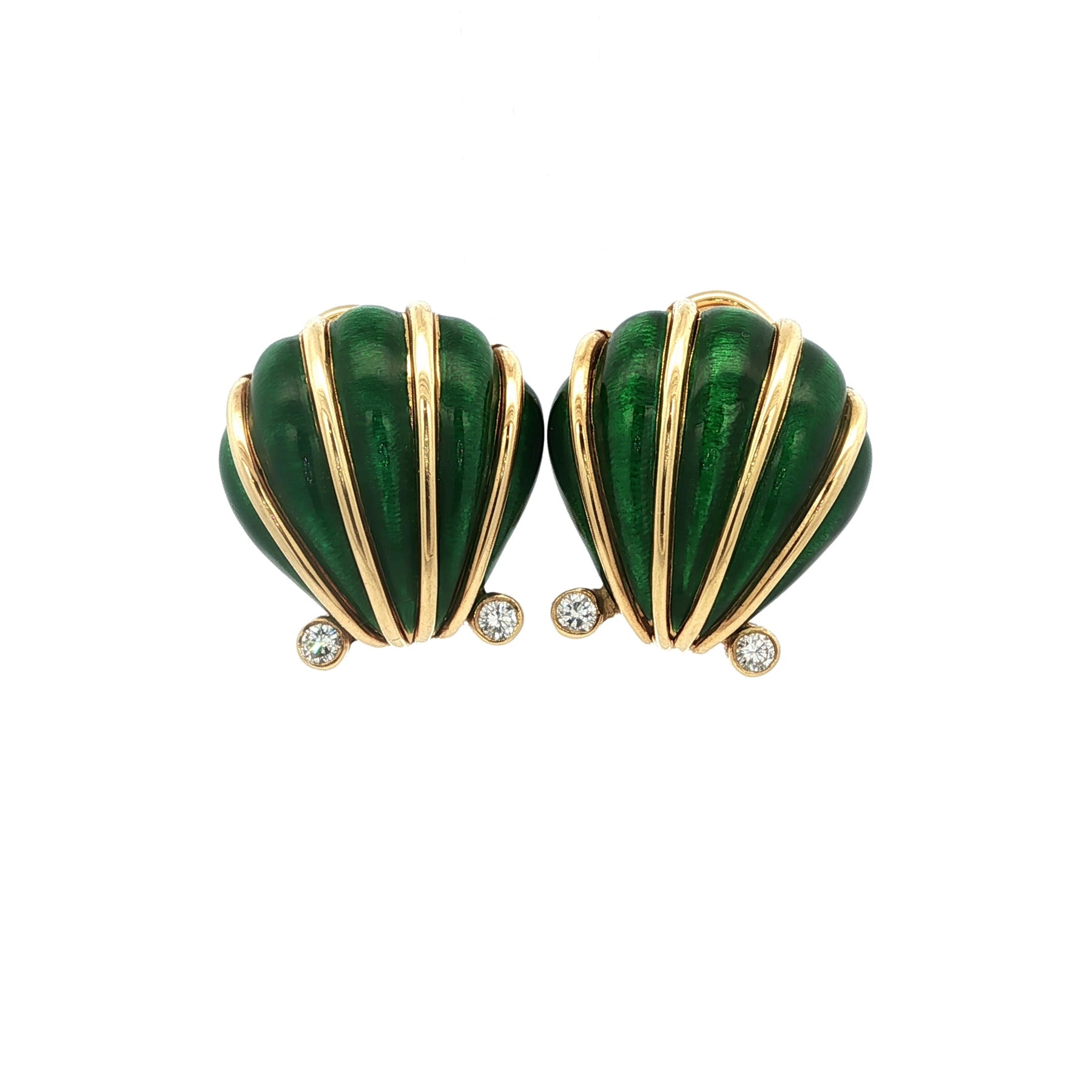 Tiffany & Co. Schlumberger Green Enamel Shell Earrings in 18K Yellow Gold. Each earring is accented by two brilliant round diamonds. The earrings approximately measure 0.80" by 0.70" and weigh 21.5 grams.