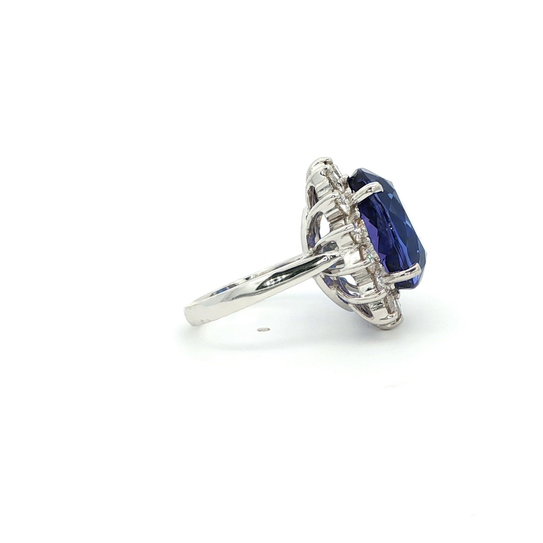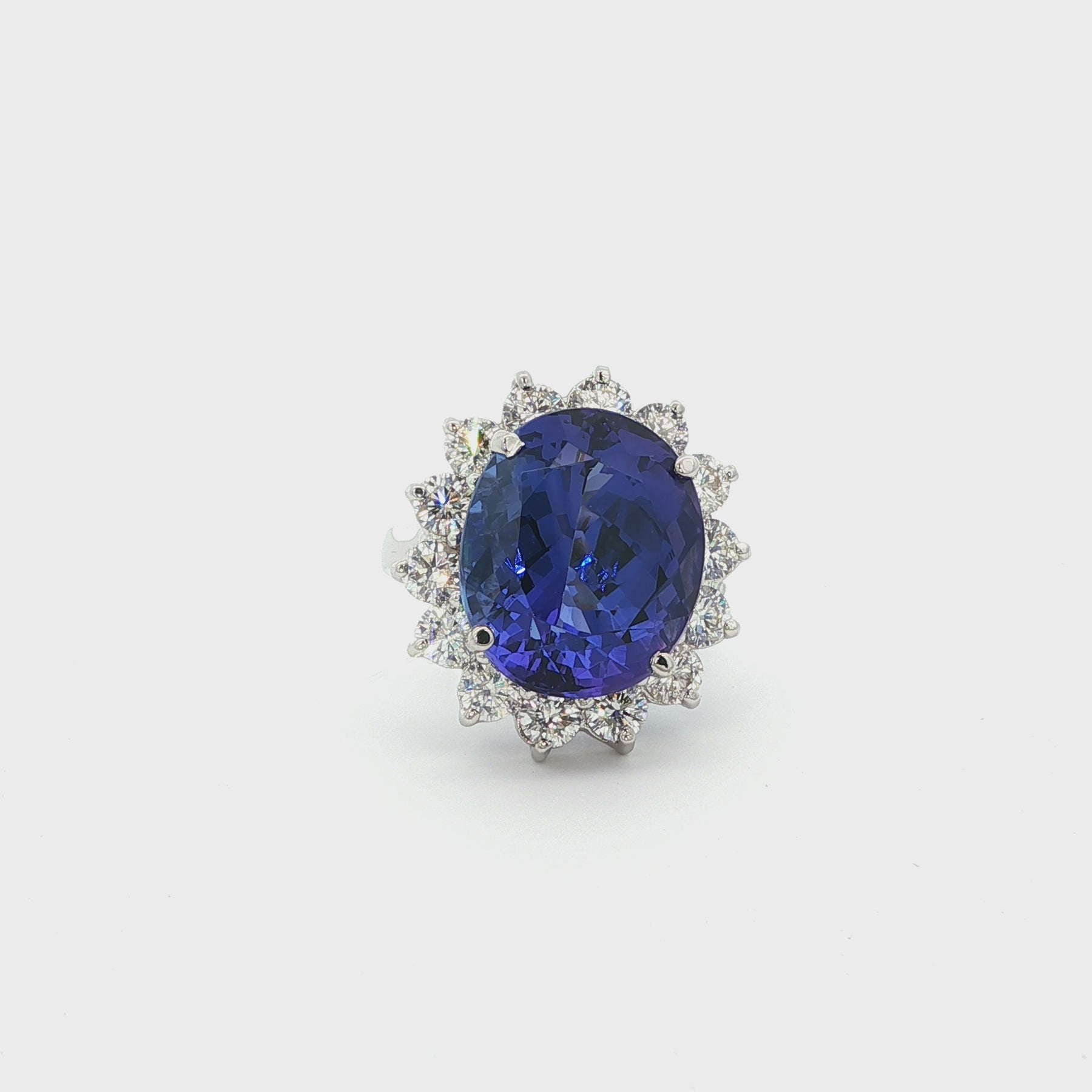 Oval Tanzanite & Diamond Halo Ring in 18K White Gold. The ring features a 13.5ct oval cut tanzanite, accented by a halo of approximately 2.4ctw of brilliant round diamonds. The ring is a size 7 and weighs 10.4 grams.