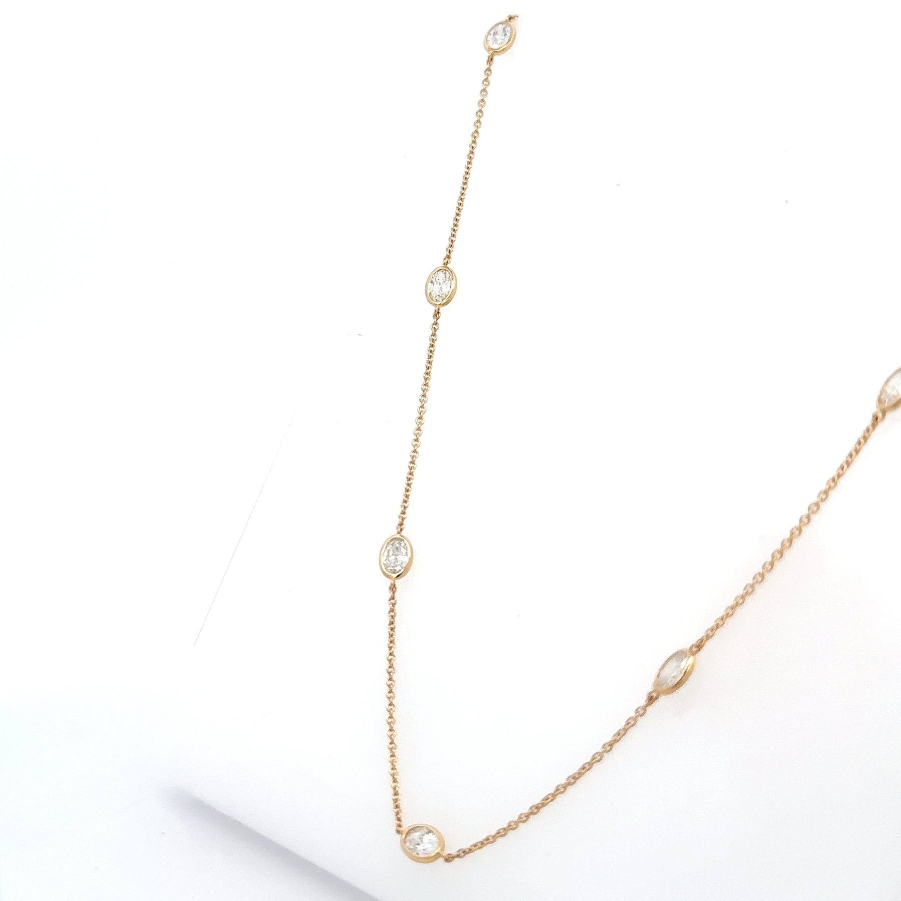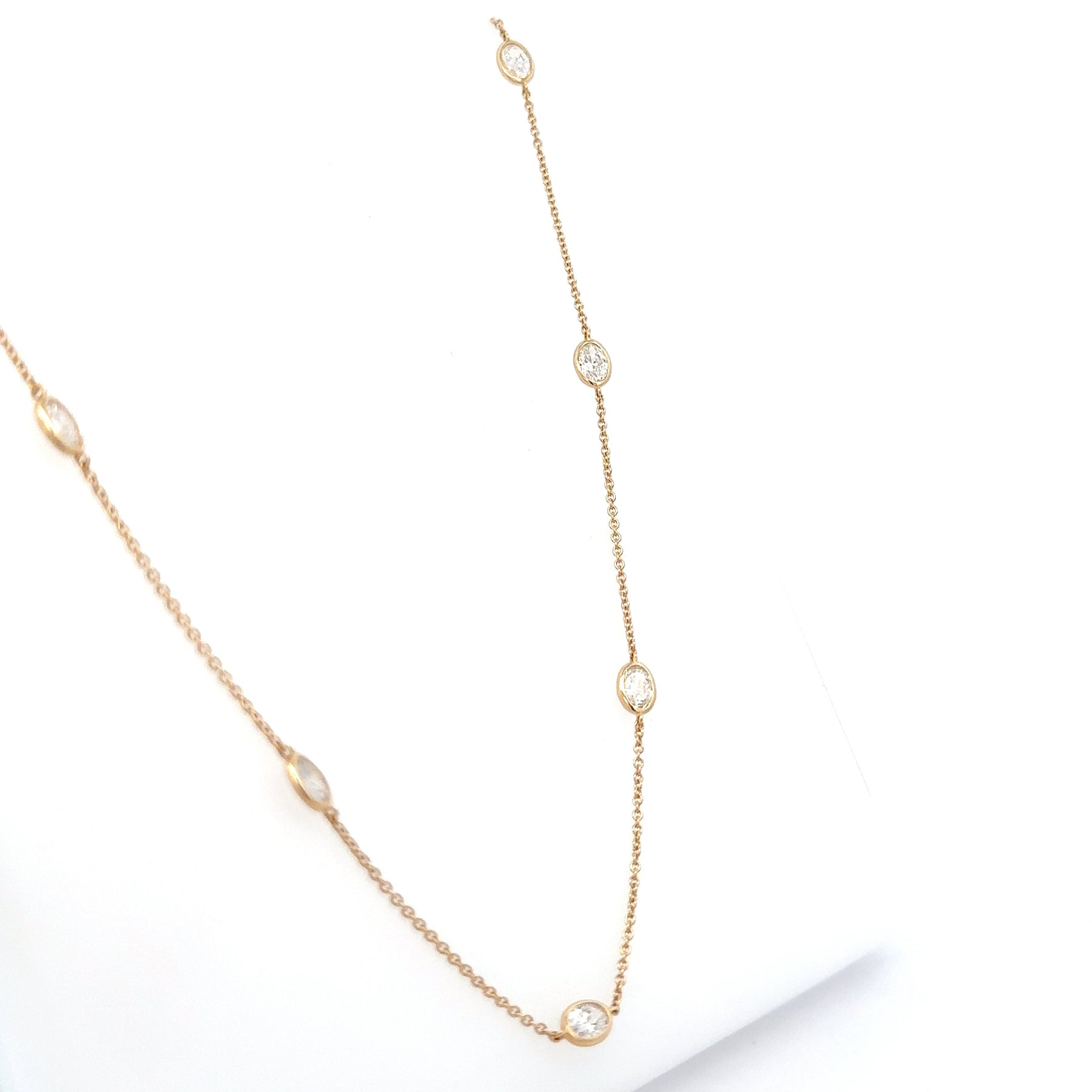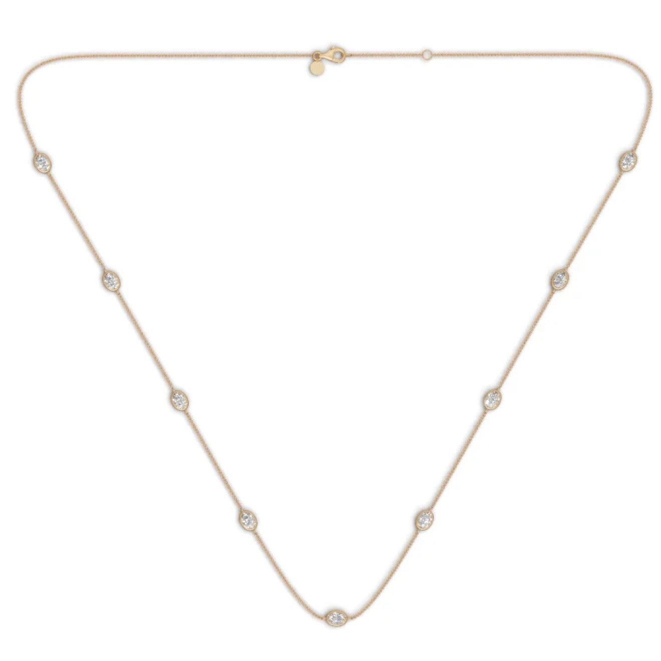 Lab Created Oval Diamond Bezel Station Necklace in 14K Yellow Gold. The necklace features 9 lab oval diamonds with 2.25 carat total weight. The necklace is 16-18 inches long and weighs 3 grams.