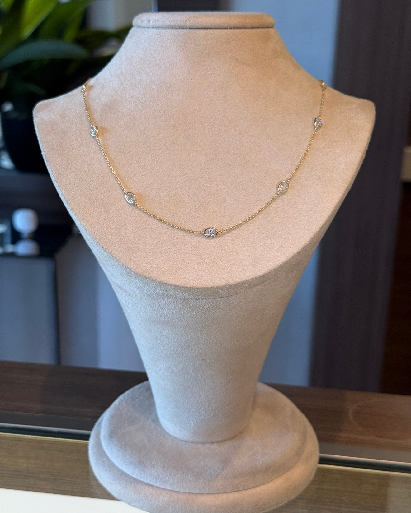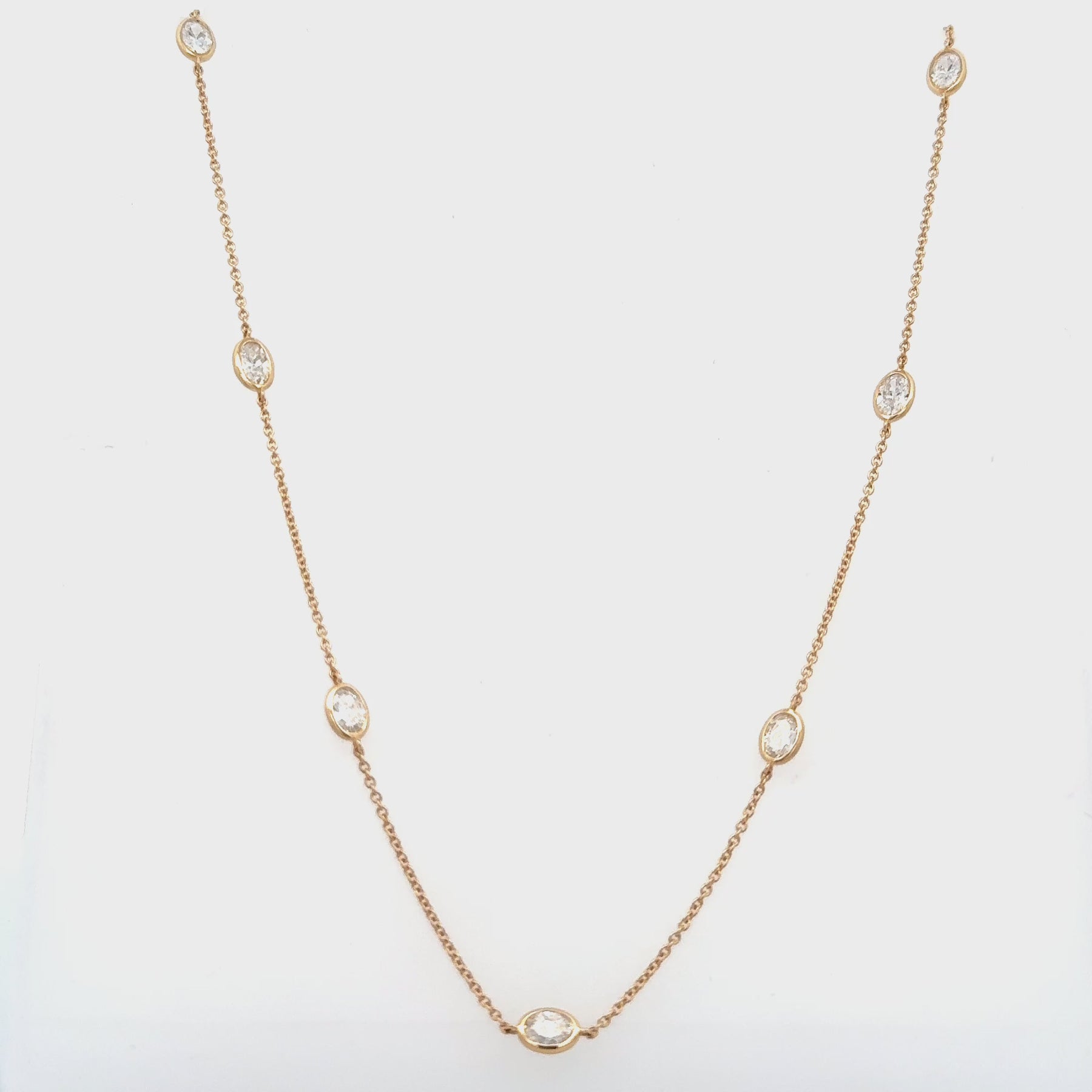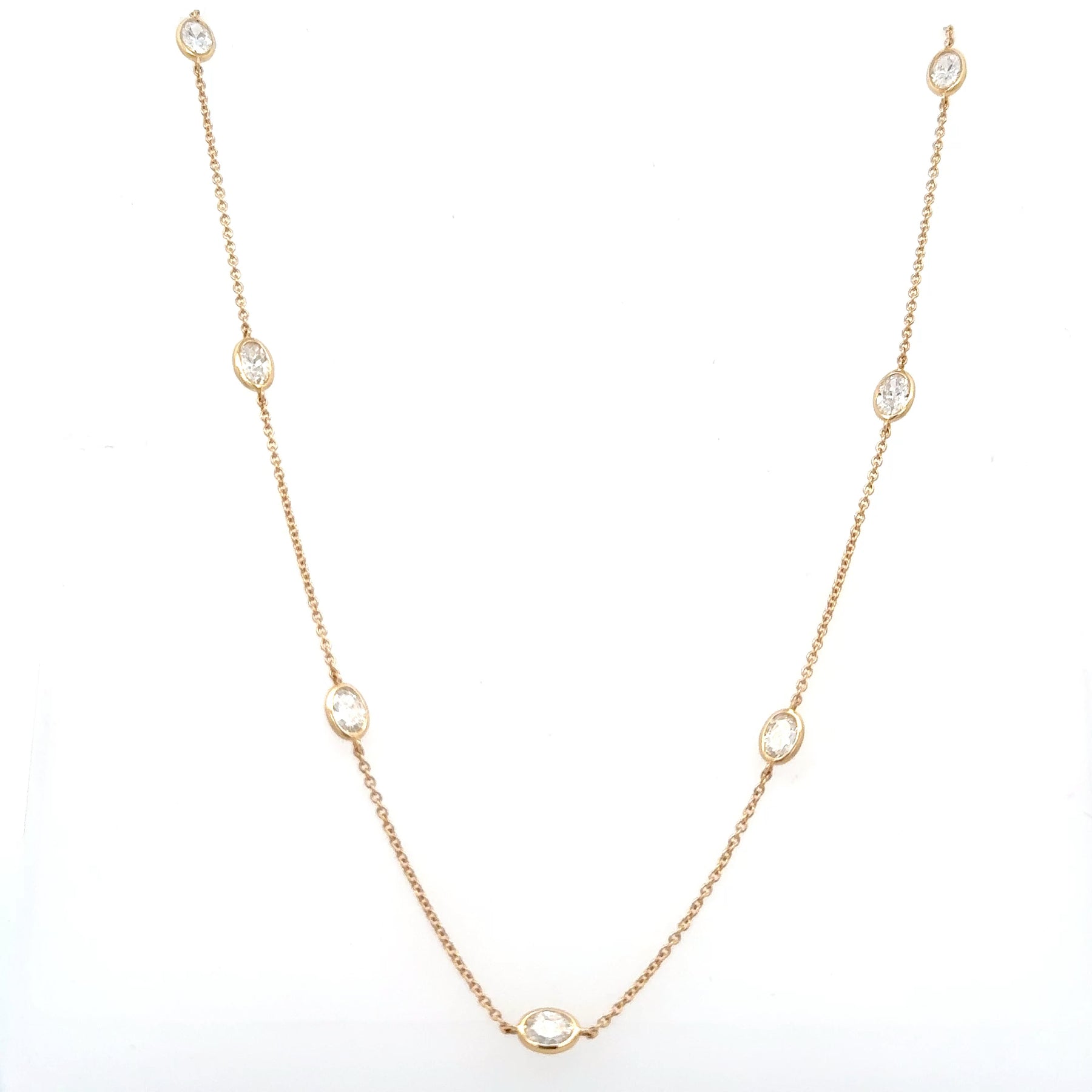 Lab Created Oval Diamond Bezel Station Necklace in 14K Yellow Gold. The necklace features 9 lab oval diamonds with 2.25 carat total weight. The necklace is 16-18 inches long and weighs 3 grams.